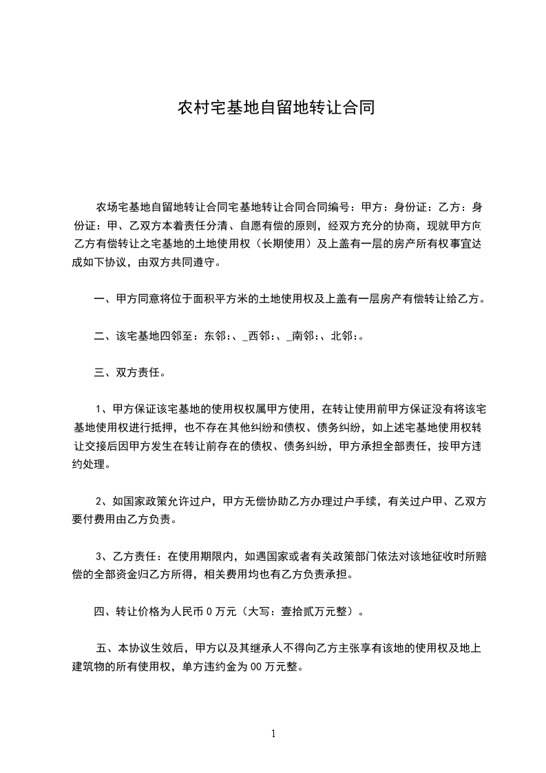 甲方自愿将巷号房屋后的一块面积约平方米村民自留地有偿转让给乙方,经甲乙双方友好协商达成协议如下: