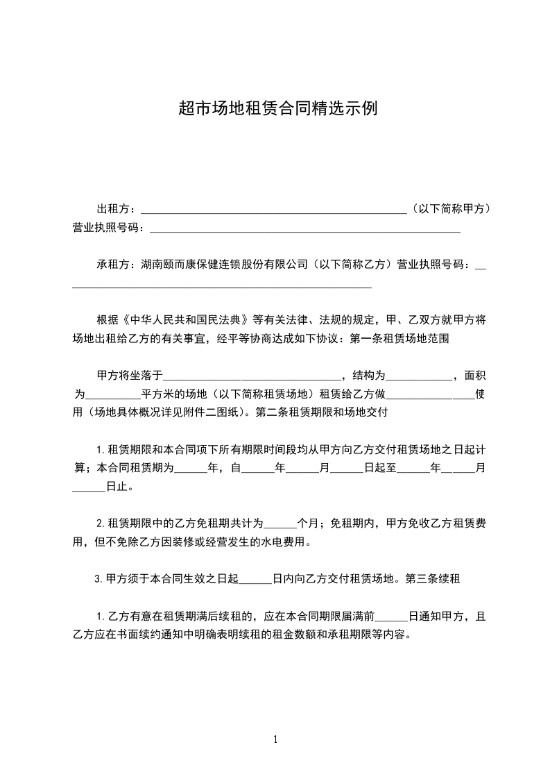 二、甲方租赁给乙方的超市场地面积为_______平方米作为经营用。