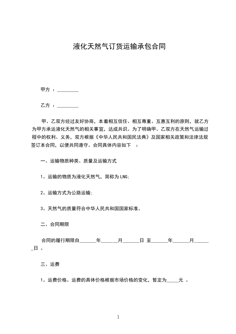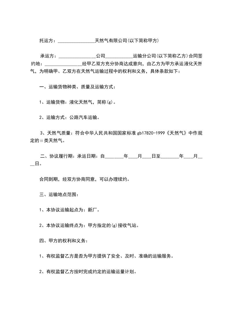 承运方:________________公司____________运输分公司(以下简称乙方)合同签约地:________________经甲乙双方充分协商达成意向,由乙方为甲方承运液化天然气,为明确甲、乙双方在天然气运输过程中的权利和义务,具体条款如下: