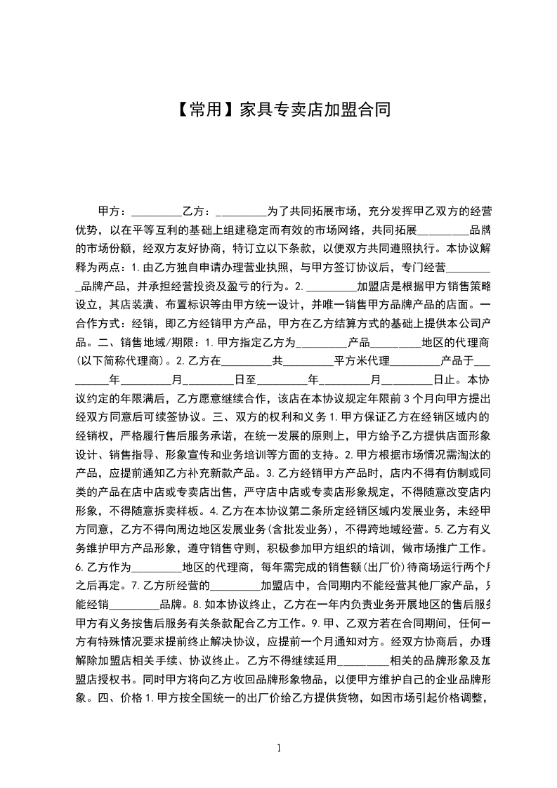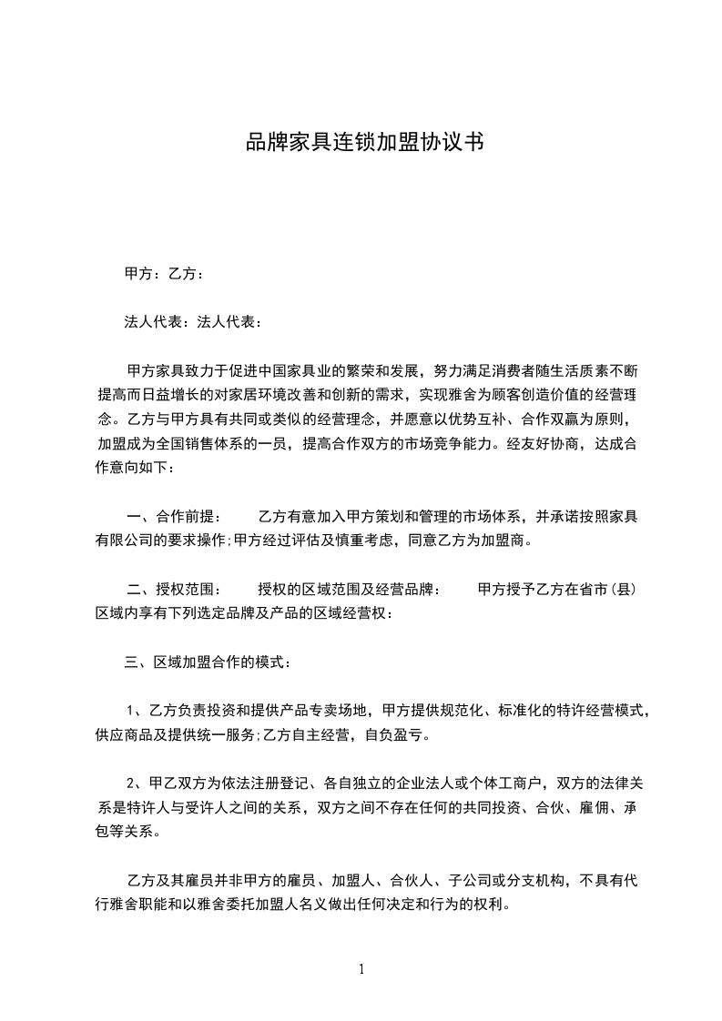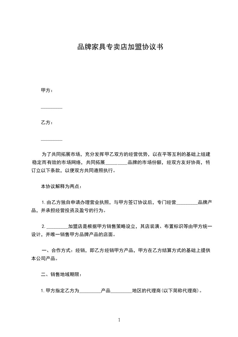 1.由乙方独自申请办理营业执照,与甲方签订协议后,专门经营_________品牌产品,并承担经营投资及盈亏的行为。