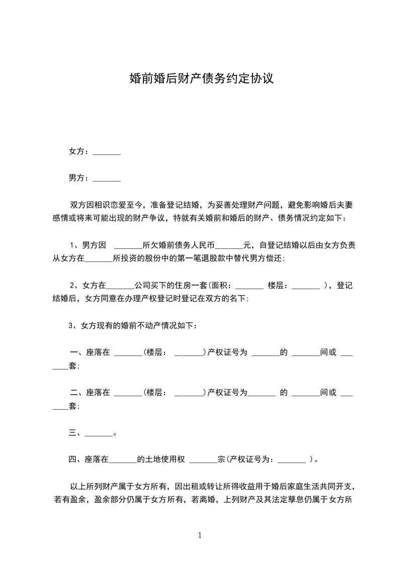 1、甲方同意座落于房屋一套归乙方所有,以及甲乙双方婚姻存续期间的其它全部财产归乙方所有。