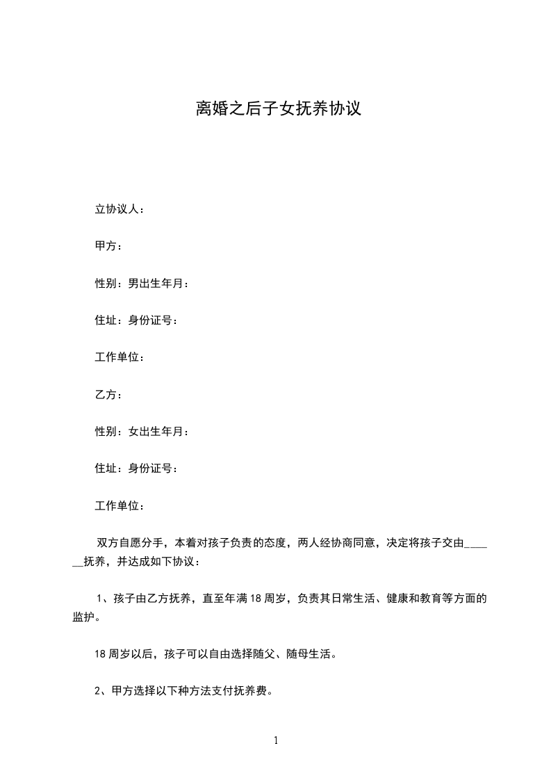 1、孩子由乙方抚养,直至年满18周岁,负责其日常生活、健康和教育等方面的监护。