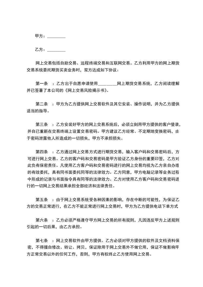 十五、本协议一式二份。为本公司《合同文件》的有效组成部分,由客户和期货经纪公司授权人签章后即生效。客户和本经纪公司各执一份,均具有同等法律效力。