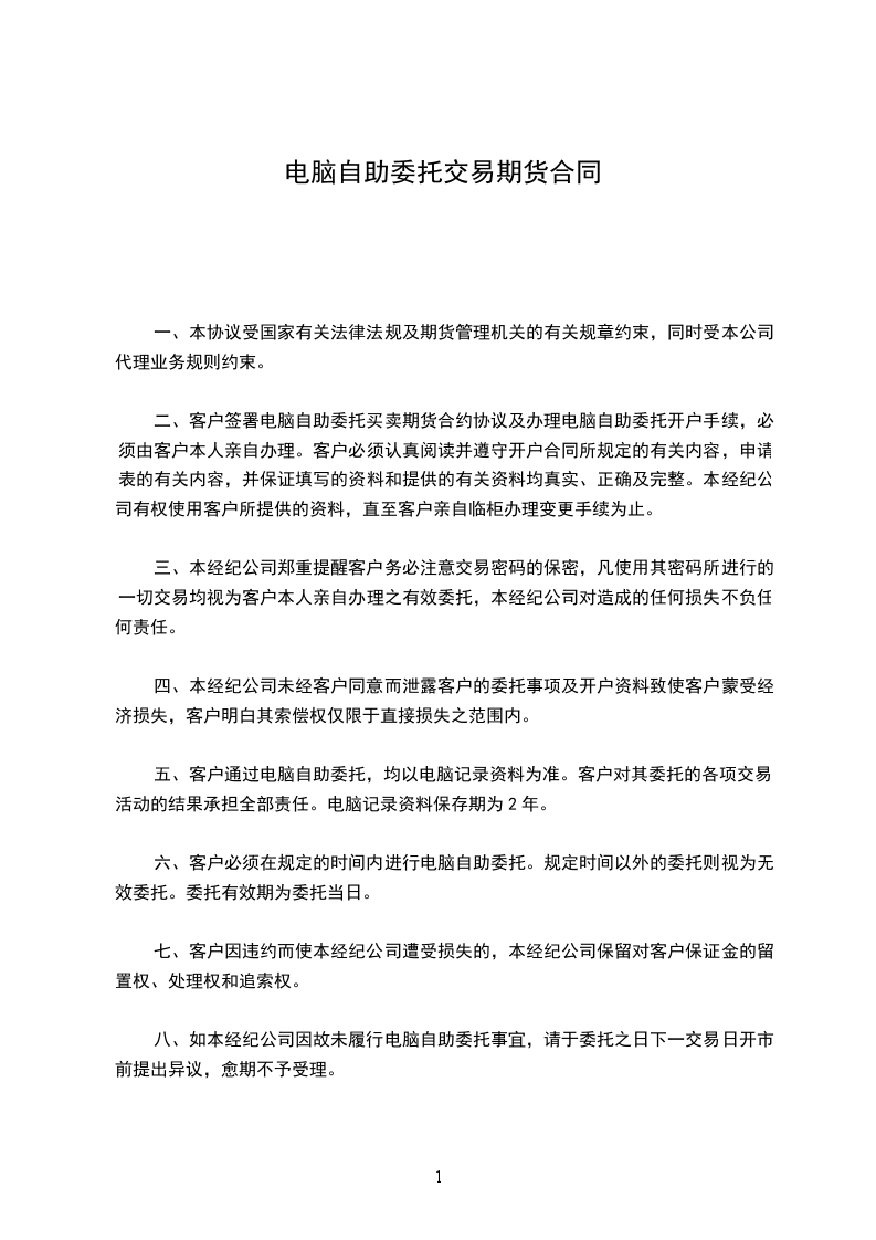 二、客户签署电脑自助委托买卖期货合约协议及办理电脑自助委托开户手续,必须由客户本人亲自办理。客户必须认真阅读并遵守开户合同所规定的有关内容,申请表的有关内容,并保证填写的资料和提供的有关资料均真实、正确及完整。本经纪公司有权使用客户所提供的资料,直至客户亲自临柜办理变更手续为止。