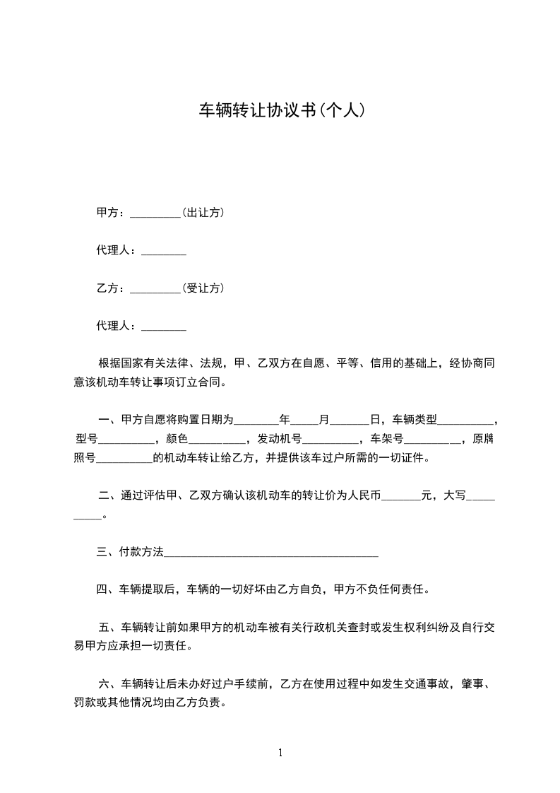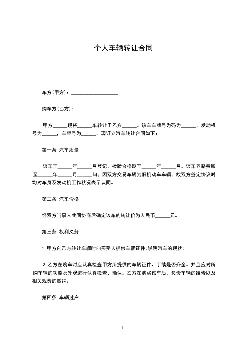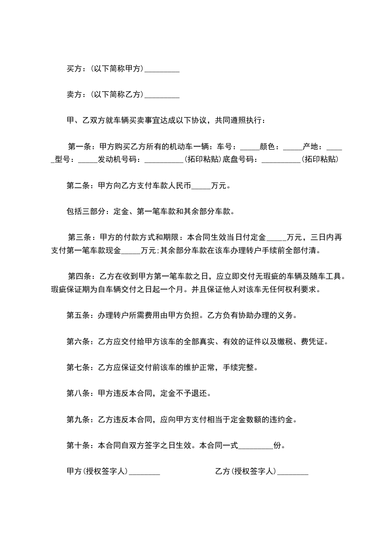 第一条:甲方购买乙方所有的机动车一辆:车号:_____颜色:_____产地:_____型号:_____发动机号码:__________(拓印粘贴)底盘号码:__________(拓印粘贴)