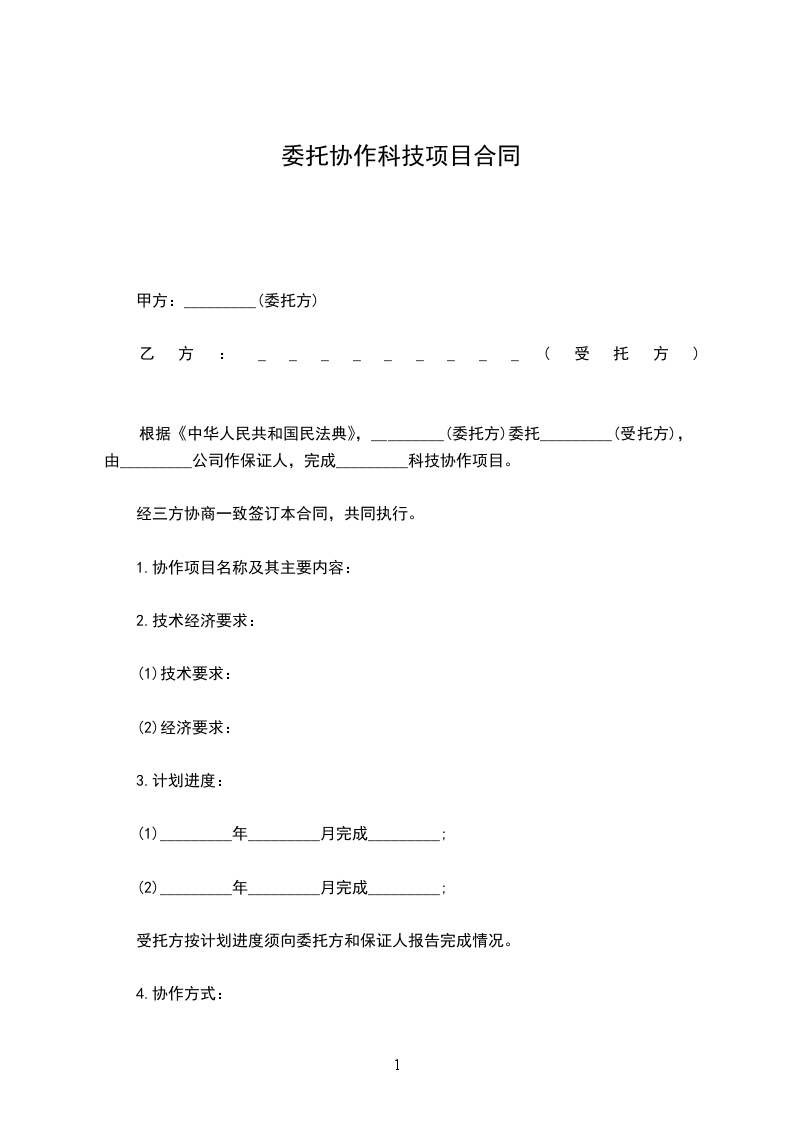 根据《中华人民共和国民法典》,_________(委托方)委托_________(受托方),由_________公司作保证人,完成_________科技协作项目。