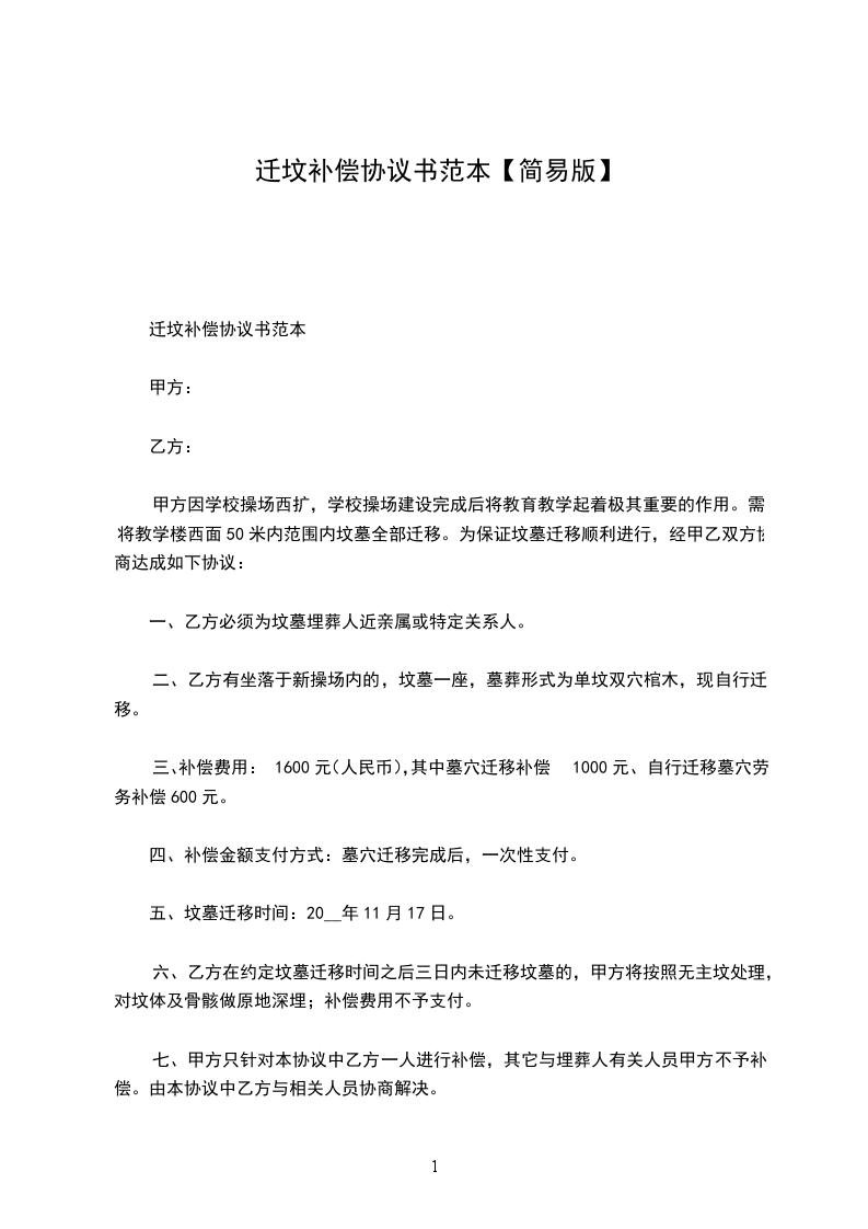 鉴于甲方因[具体项目名称]需要,需迁移乙方位于[坟地具体位置]的坟墓,经双方友好协商,就迁坟补偿事宜达成如下协议: