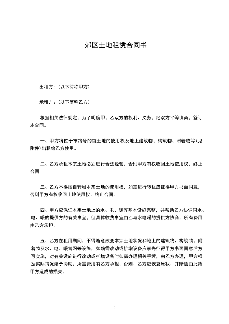 一、甲方将位于市路号的亩土地的使用权及地上建筑物、构筑物、附着物等(见附件)出租给乙方使用。