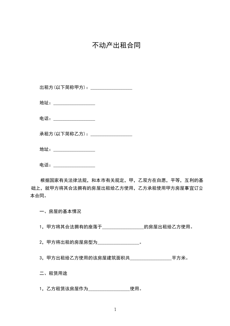 1,甲方将其合法拥有的座落于__________________的房屋出租给乙方使用。