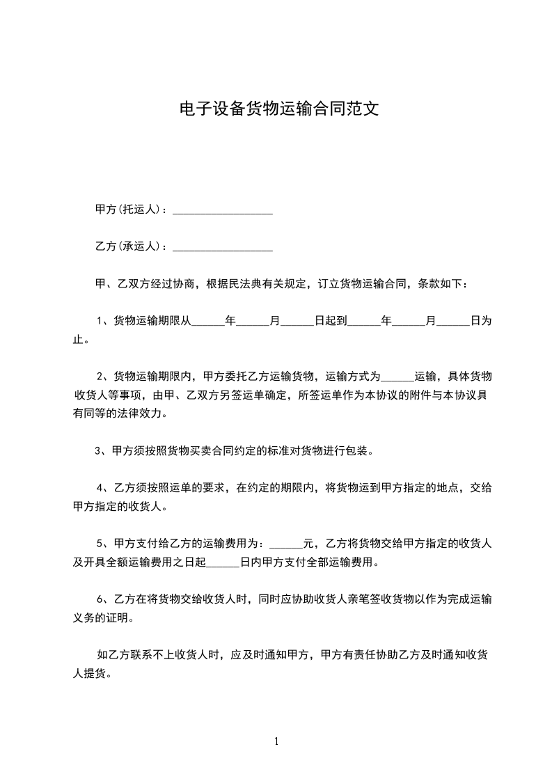 7、甲方交付乙方承运的货物乙方对此应予以高度重视,避免暴晒、雨淋,确保包装及内容物均完好按期运达指定地。