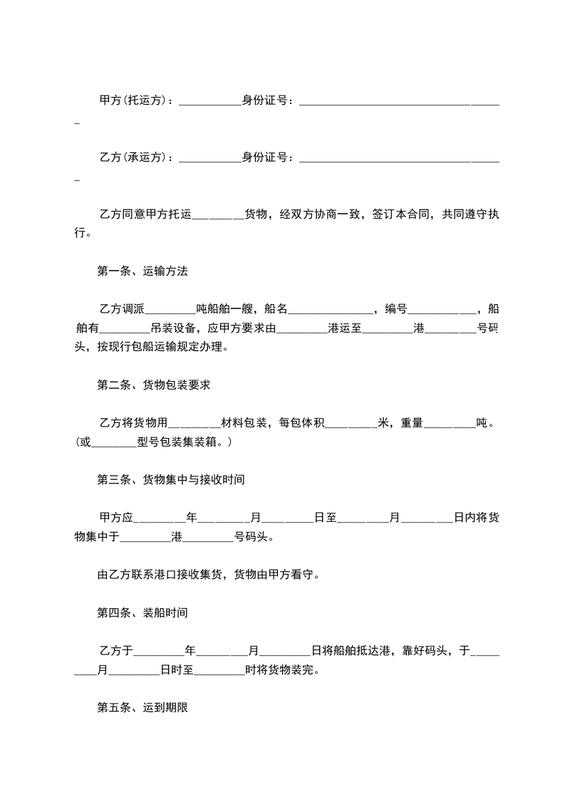 乙方调派_________吨船舶一艘,船名_______________,编号____________,船舶有_________吊装设备,应甲方要求由_________港运至_________港_________号码头,按现行包船运输规定办理。