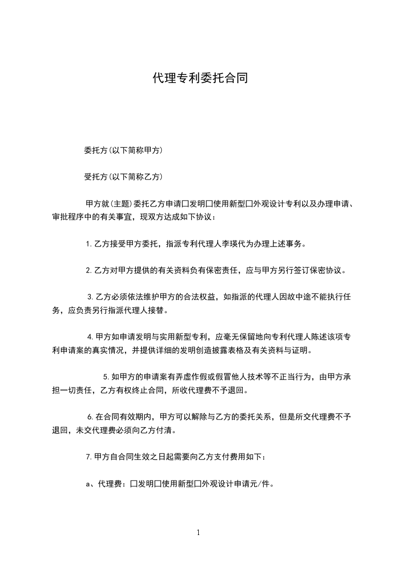 1.乙方接受甲方委托,指派专利代理人李瑛代为办理上述事务。
