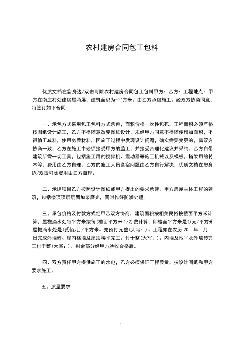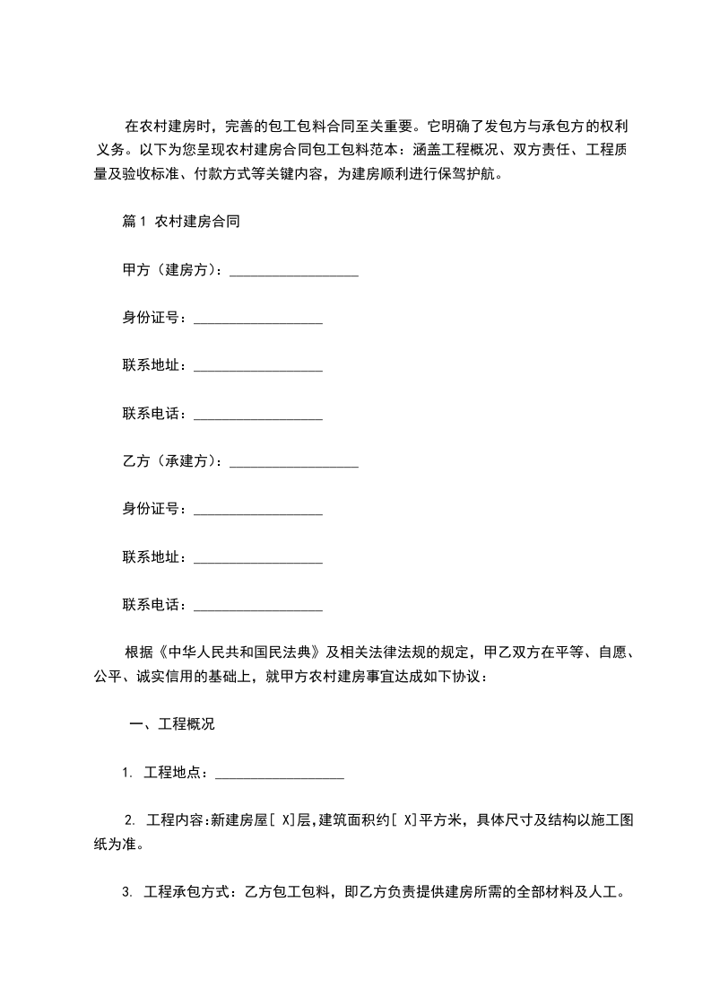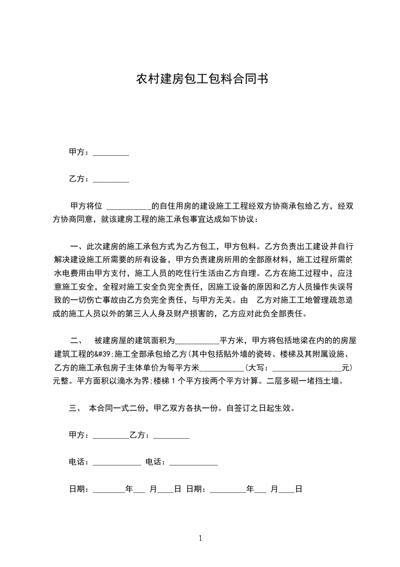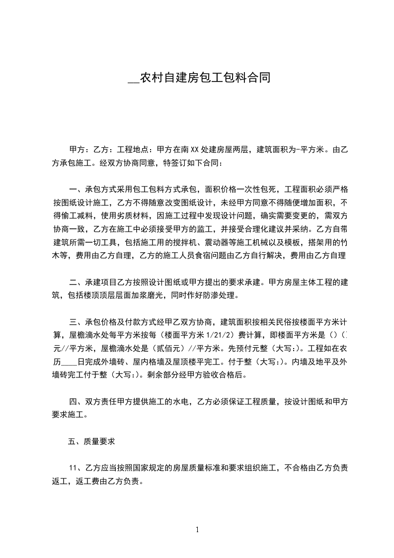 篇1 农村建房合同(包工包料)