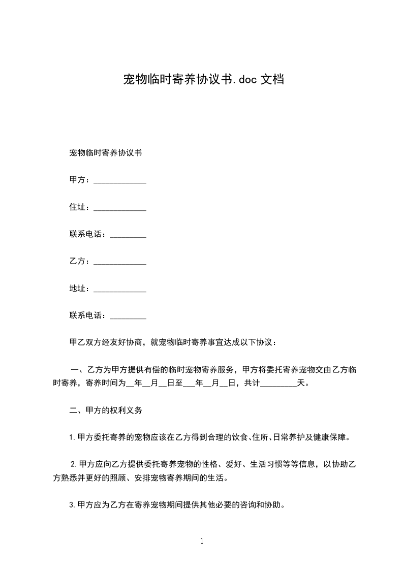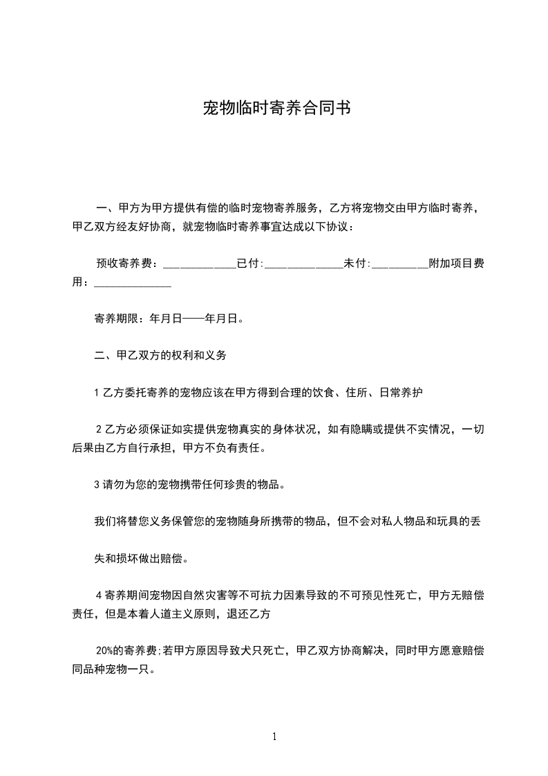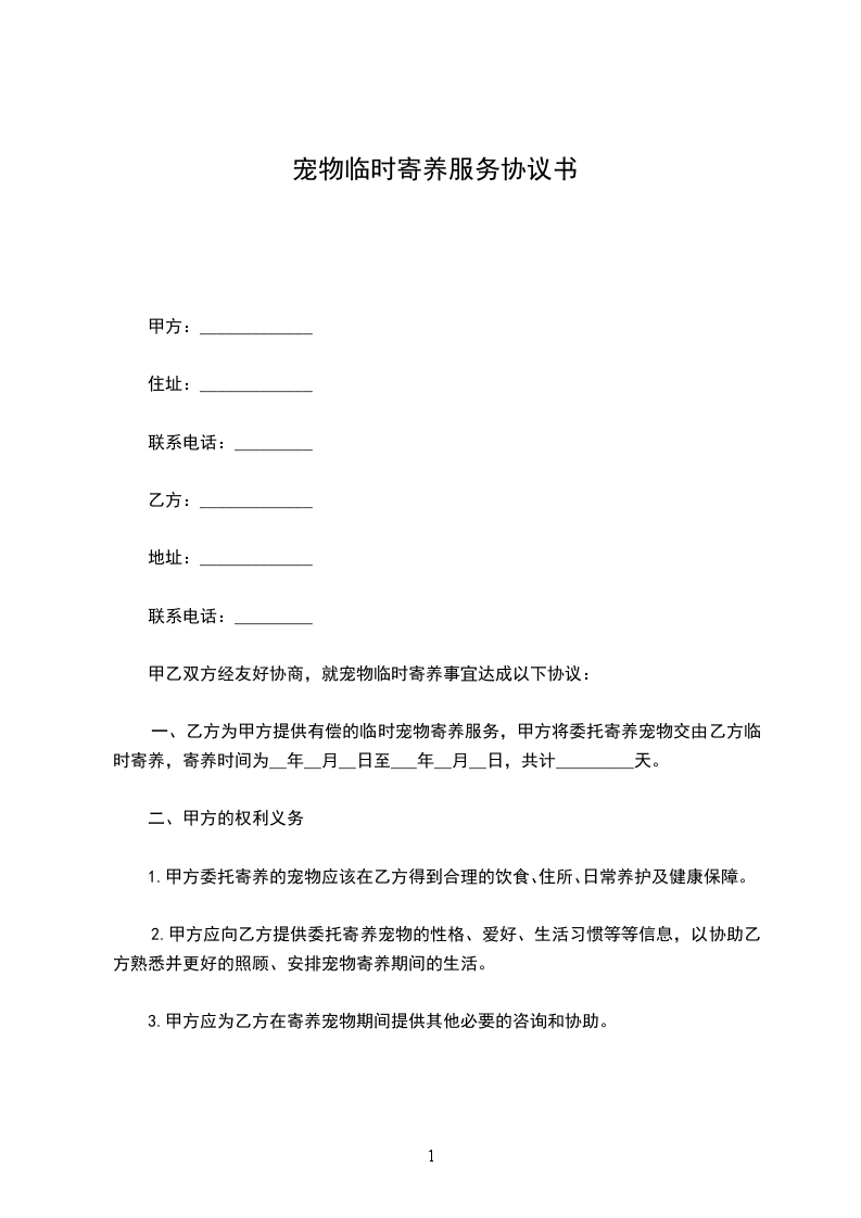 一、甲方为甲方提供有偿的临时宠物寄养服务,乙方将宠物交由甲方临时寄养,甲乙双方经友好协商,就宠物临时寄养事宜达成以下协议: