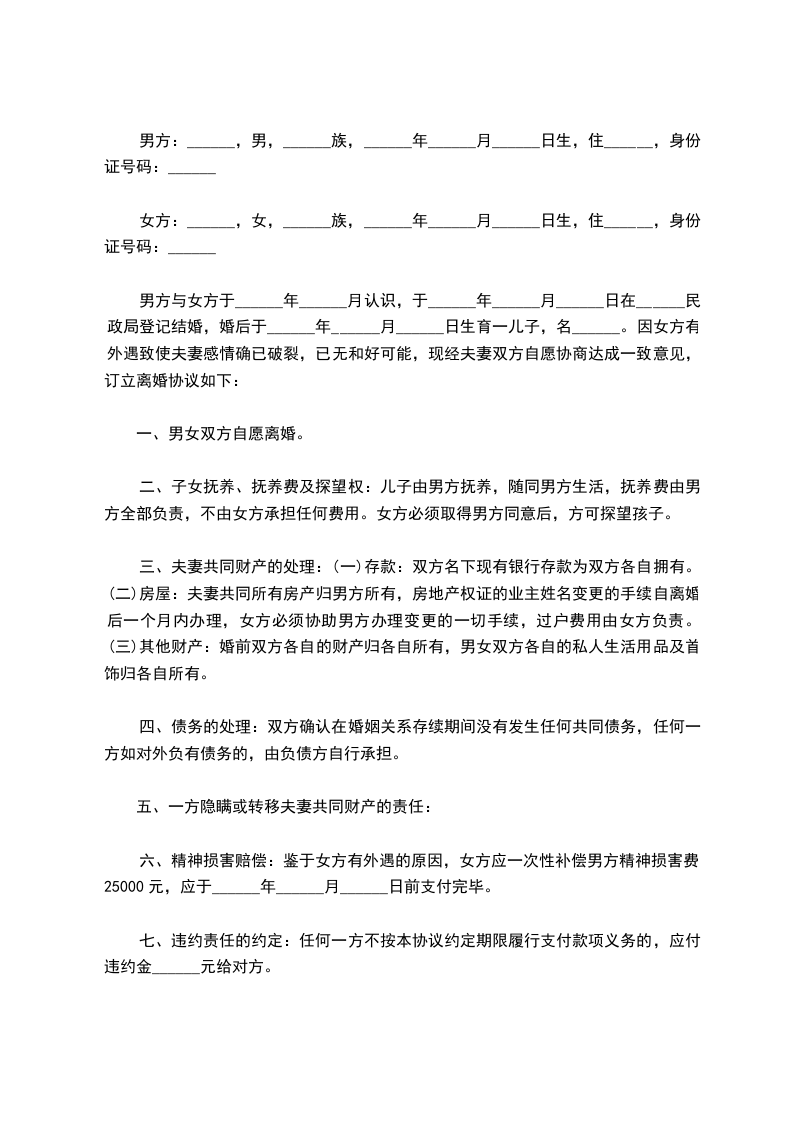 男方与女方于______年______月认识,于______年______月______日在______民政局登记结婚,婚后于______年______月______日生育一儿子,名______。因女方有外遇致使夫妻感情确已破裂,已无和好可能,现经夫妻双方自愿协商达成一致意见,订立离婚协议如下: