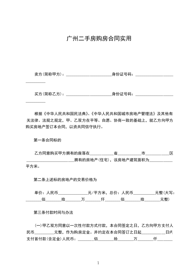 1. 甲方所售房屋位于广州市__________区(县)__________路__________号__________栋__________单元__________室,建筑面积为__________平方米,房屋用途为__________。