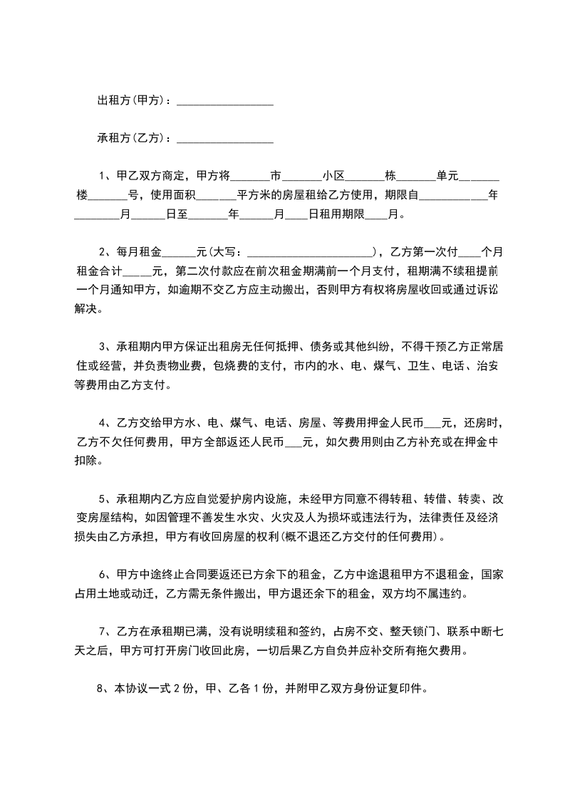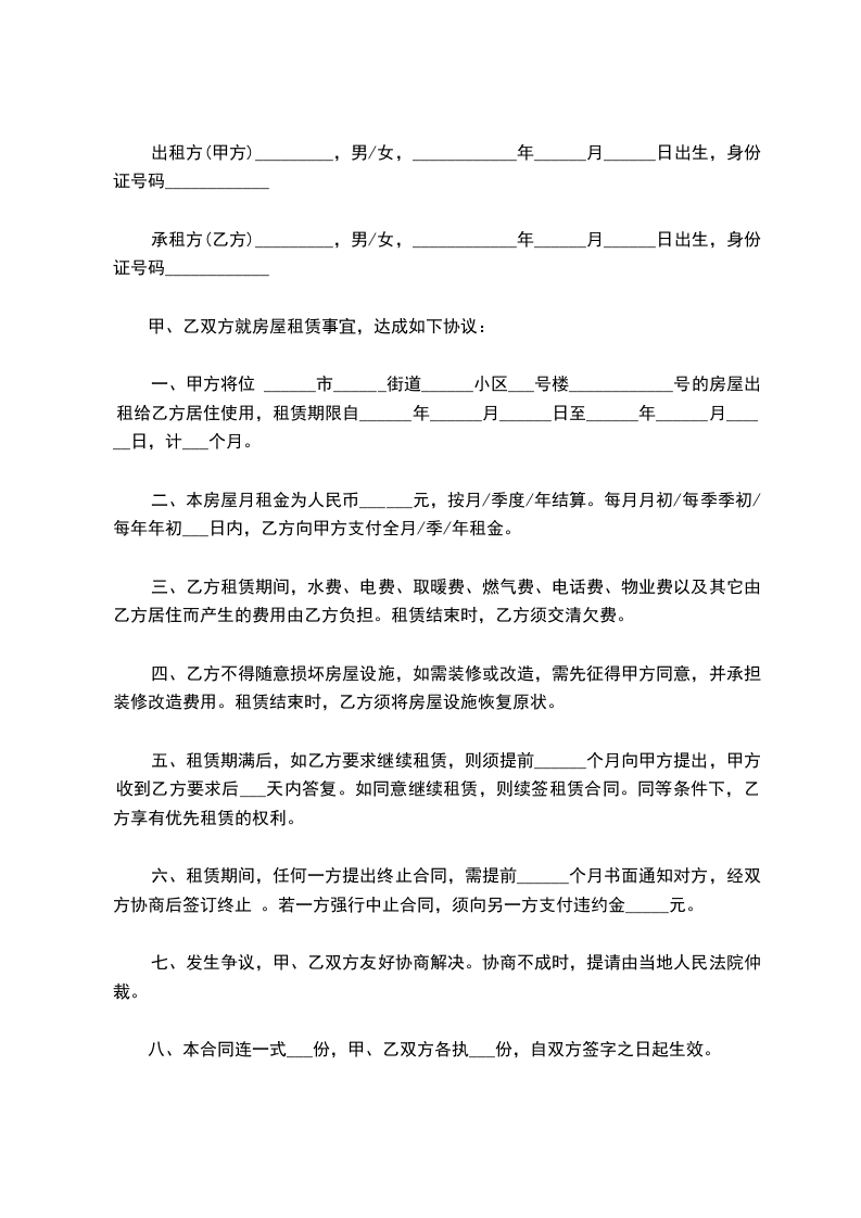 承租方:_________(以下简称乙方身份证号:__________________电话:__________________甲乙双方经协商,于年________月________日订立本租房合同,并就以下各条款达成协议: