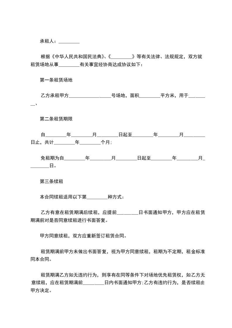根据《中华人民共和国民法典》、《_________》等有关法律、法规规定,双方就租赁场地从事_________有关事宜经协商达成协议如下: