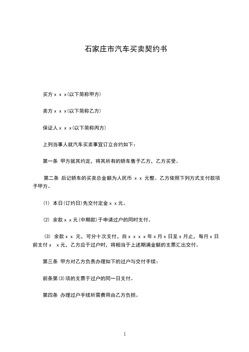 第二条 后记轿车的买卖总金额为人民币 x x 元整。乙方依照下列方式支付款项予甲方。