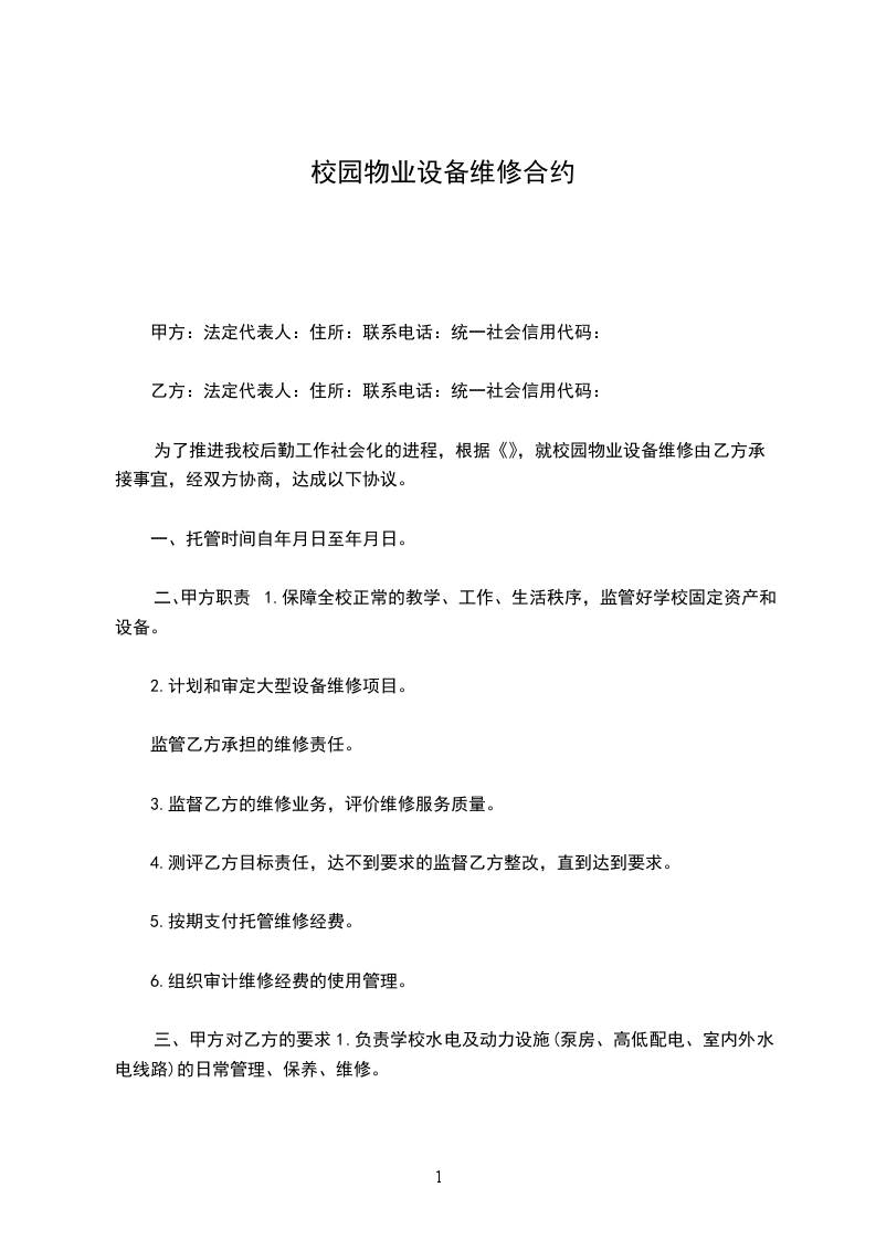 为了推进我校后勤工作社会化的进程,根据《》,就校园物业设备维修由乙方承接事宜,经双方协商,达成以下协议。