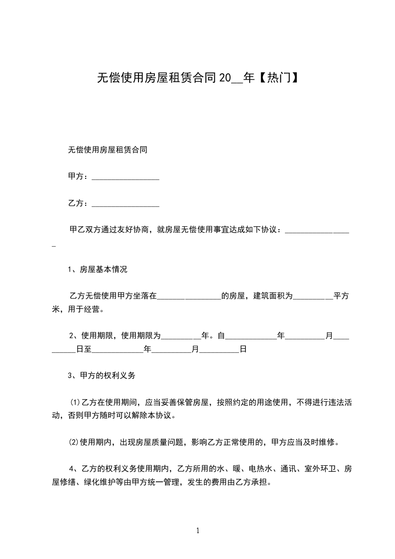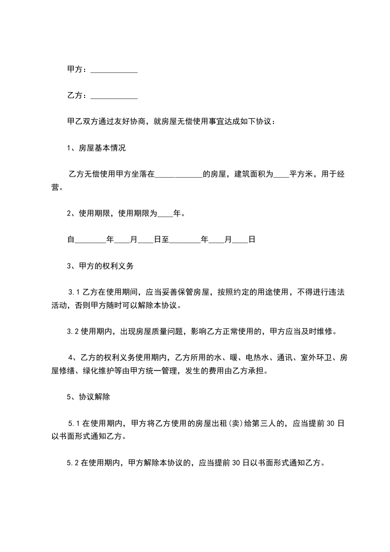 乙方无偿使用甲方坐落在____________的房屋,建筑面积为____平方米,用于经营。
