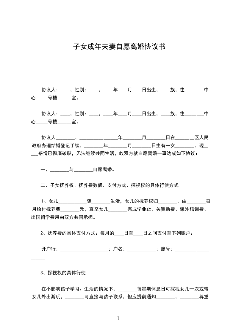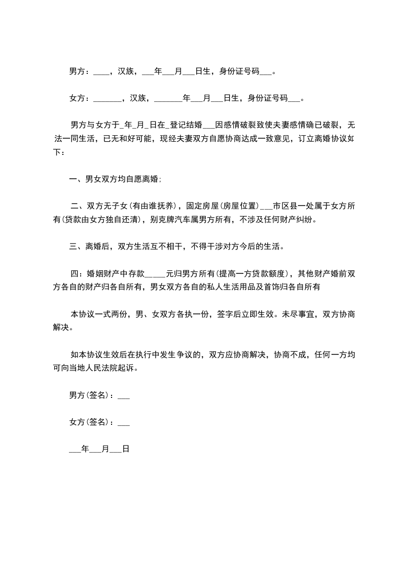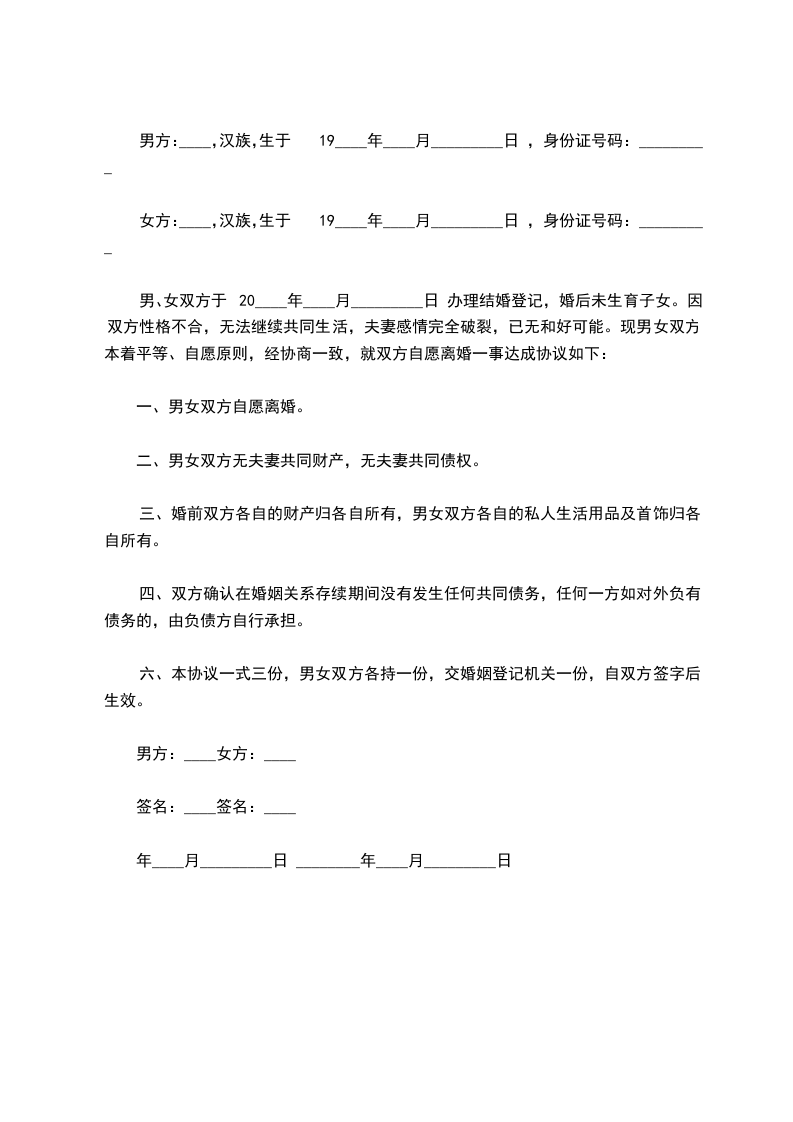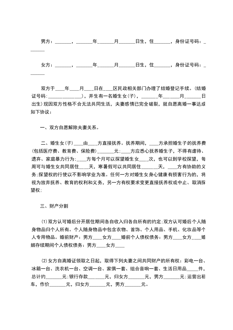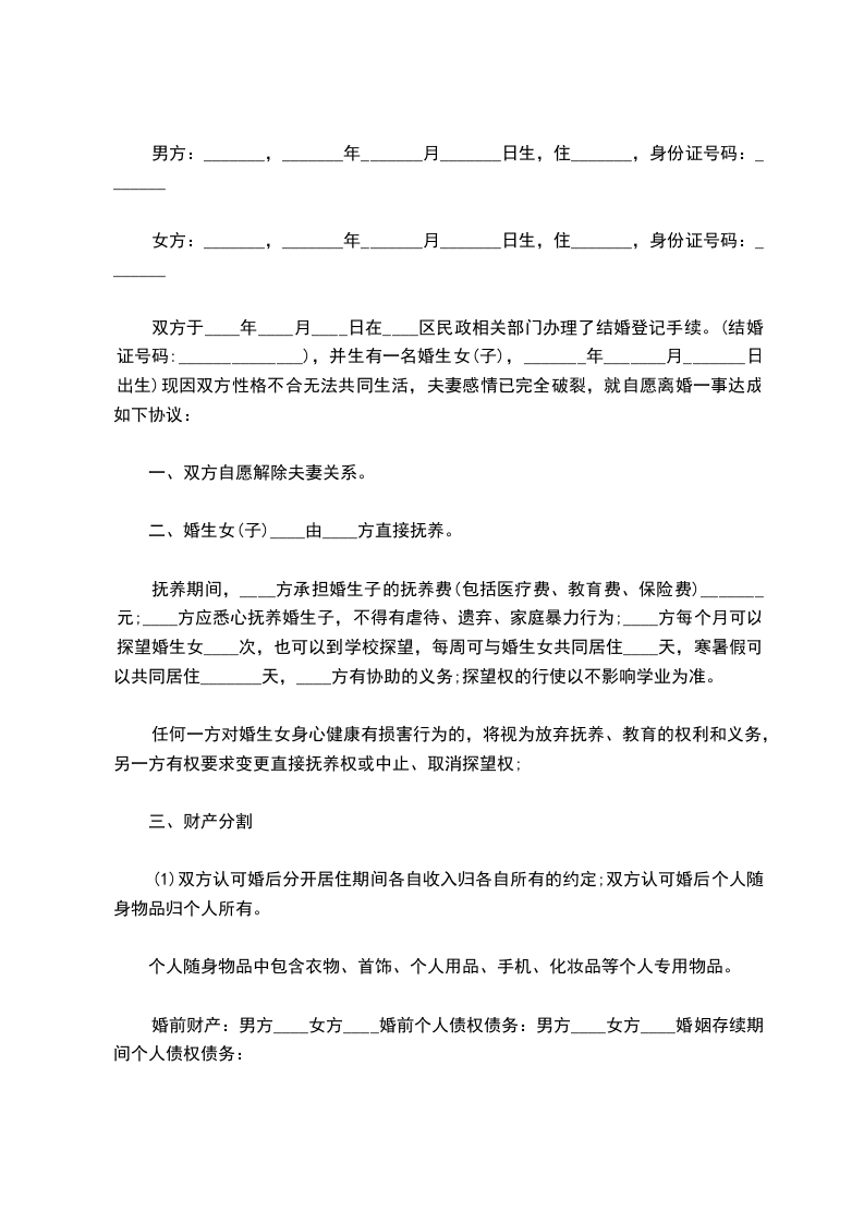 双方于____年____月____日在____区民政相关部门办理了结婚登记手续。(结婚证号码:______________),并生有一名婚生女(子),_______年_______月_______日出生)现因双方性格不合无法共同生活,夫妻感情已完全破裂,就自愿离婚一事达成如下协议: