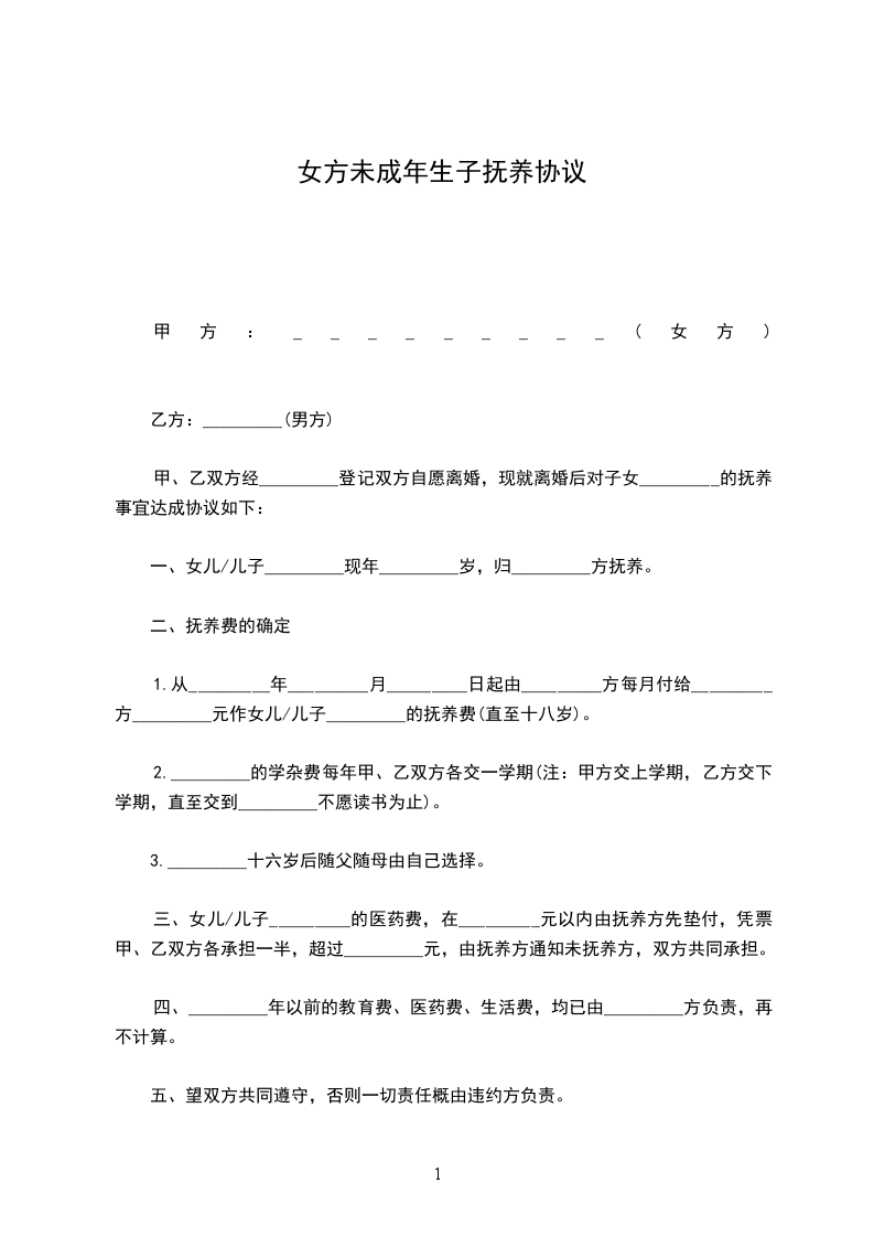 二、婚生女(子)____由____方直接抚养。抚养期间,____方承担婚生子的抚养费(包括医疗费、教育费、保险费)_______元;____方应悉心抚养婚生子,不得有虐待、遗弃、家庭暴力行为;____方每个月可以探望婚生女____次,也可以到学校探望,每周可与婚生女共同居住____天,寒暑假可以共同居住_______天,____方有协助的义务;探望权的行使以不影响学业为准。任何一方对婚生女身心健康有损害行为的,将视为放弃抚养、教育的权利和义务,另一方有权要求变更直接抚养权或中止、取消探望权;