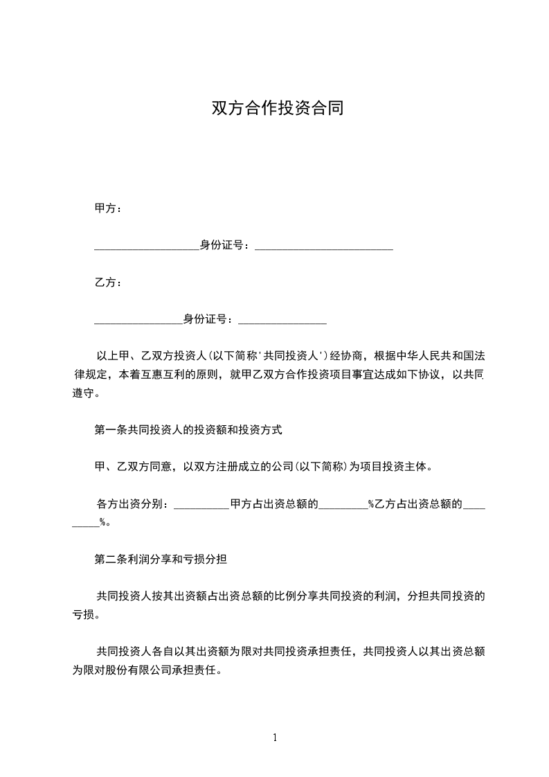 以上甲、乙双方投资人(以下简称'共同投资人')经协商,根据中华人民共和国法律规定,本着互惠互利的原则,就甲乙双方合作投资项目事宜达成如下协议,以共同遵守。
