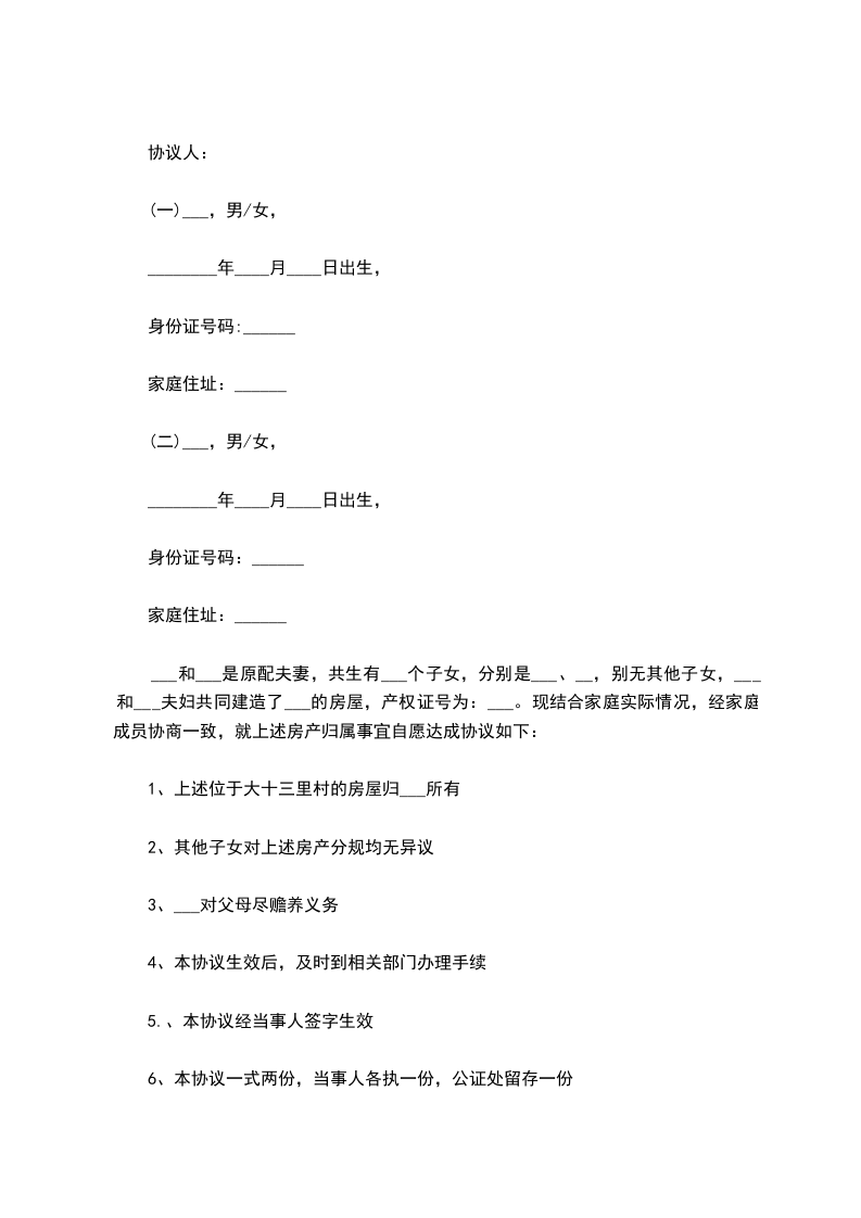 ___和___是原配夫妻,共生有___个子女,分别是___、__,别无其他子女,___和___夫妇共同建造了___的房屋,产权证号为:___。现结合家庭实际情况,经家庭成员协商一致,就上述房产归属事宜自愿达成协议如下: