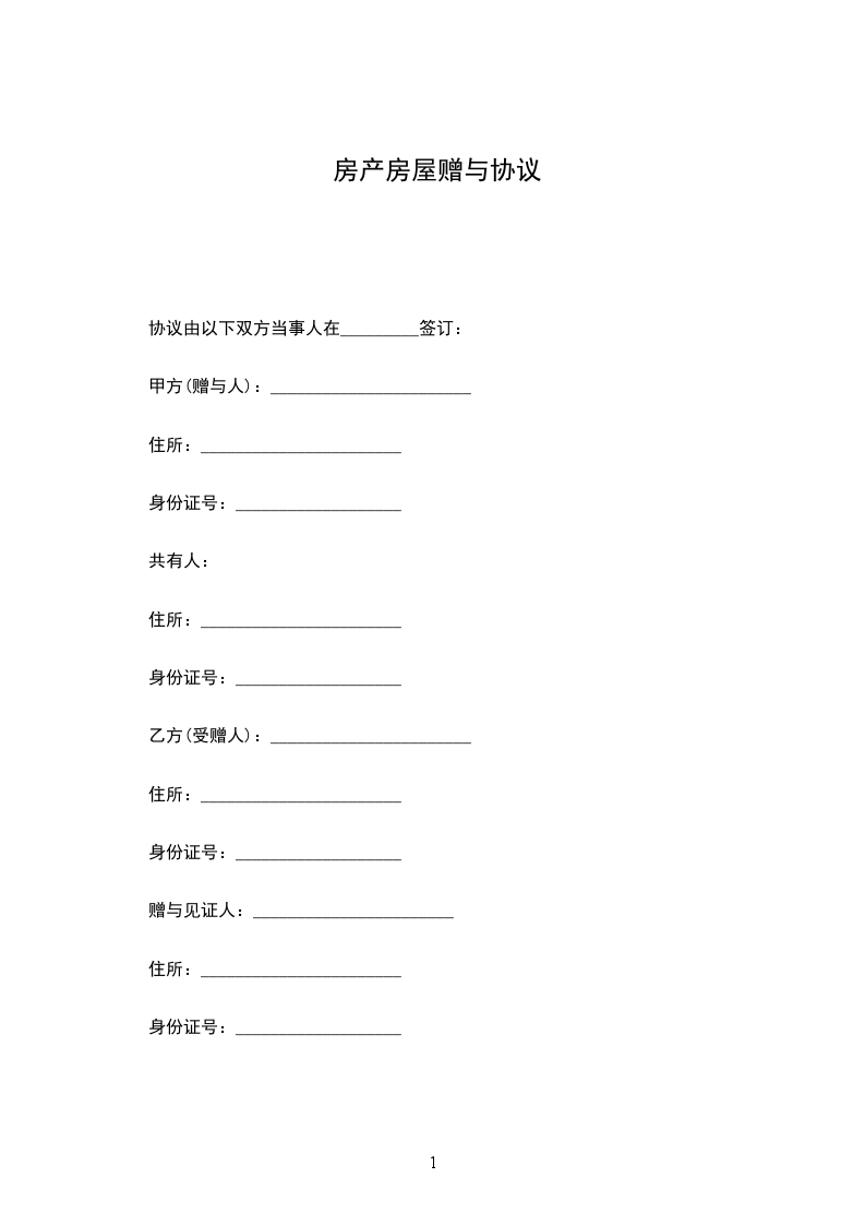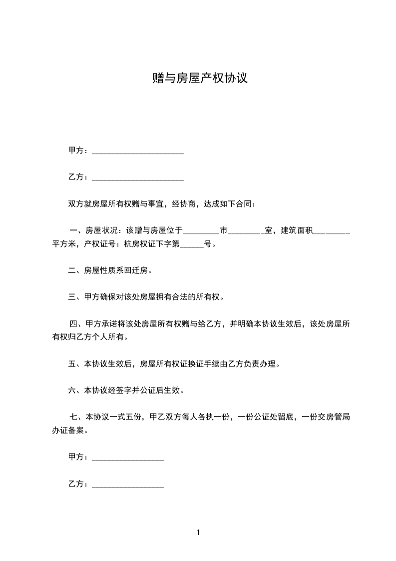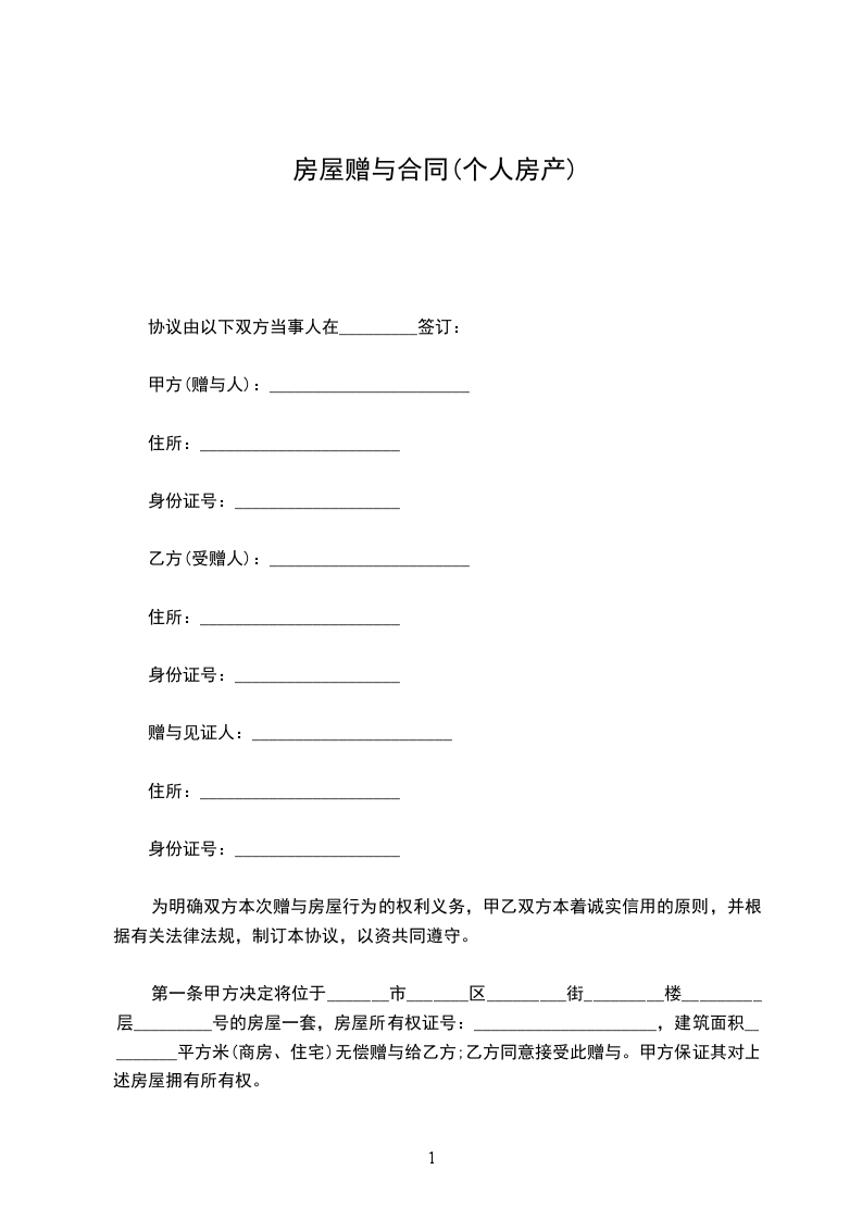 第一条甲方决定将位于_________区_________街_________楼_________层_________号的房屋一套,房屋所有权证号:,建筑面积_________平方米(商房、住宅)无偿赠与给乙方;乙方同意接受此赠与。