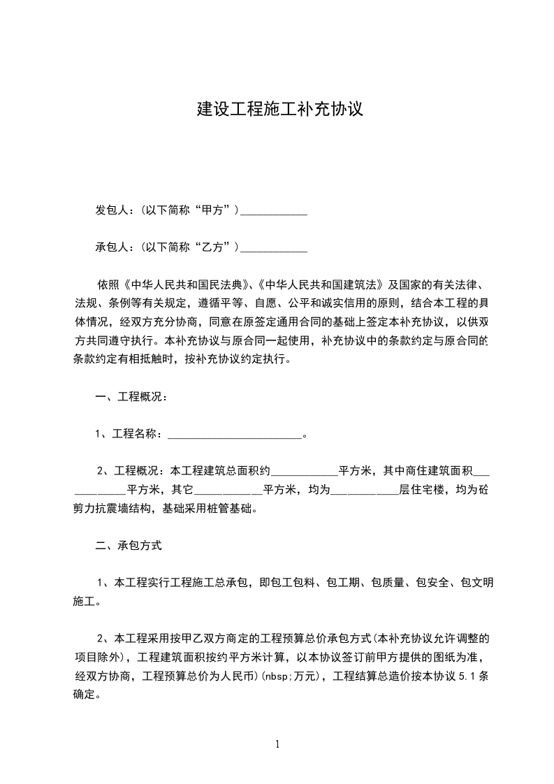定一个月内付给乙方工程款。否则,甲方按人民币壹万施工合同补充协议元/天赔付给乙方。