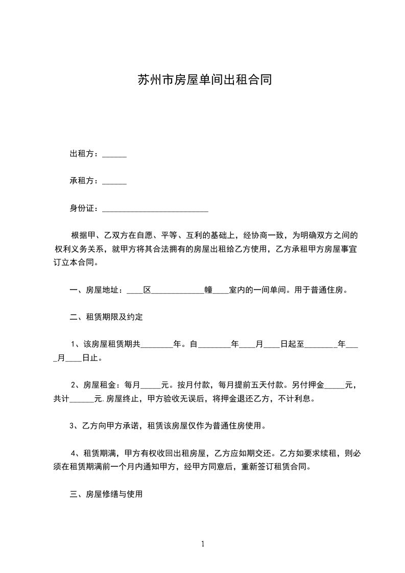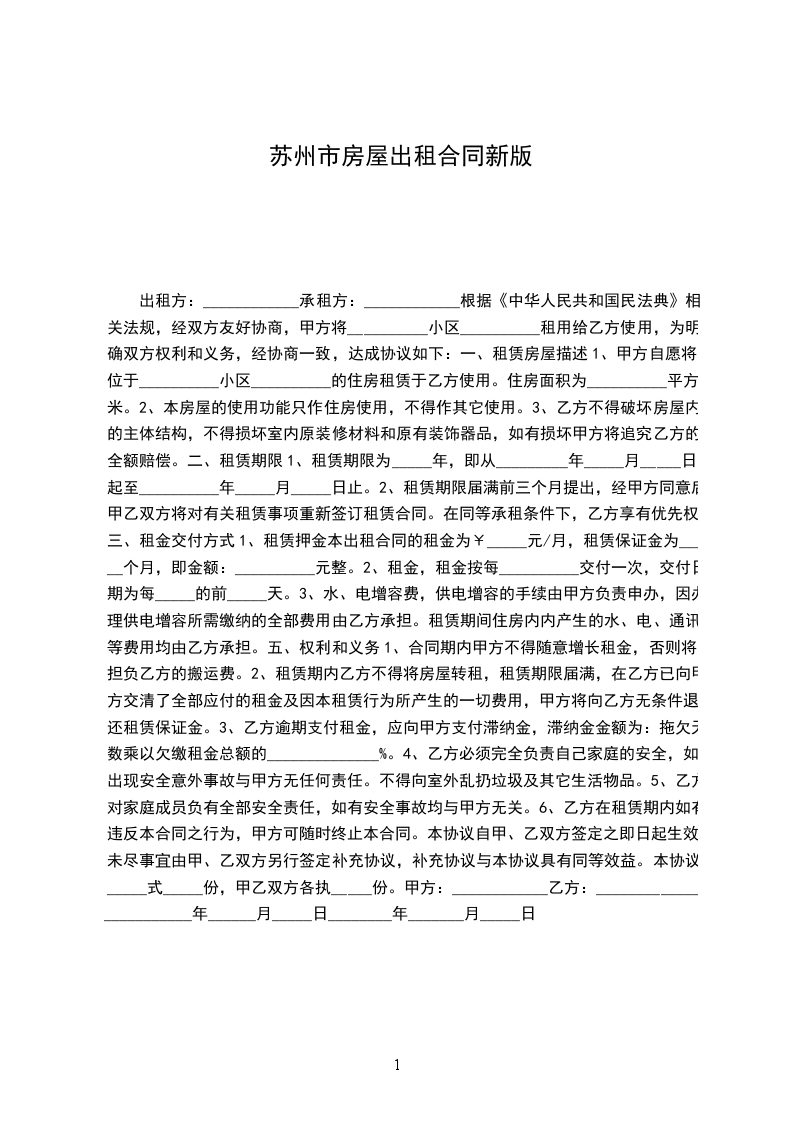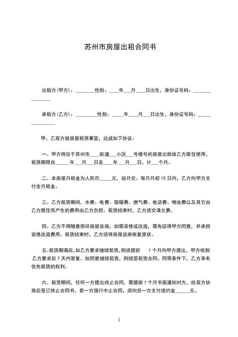 一、甲方将位于苏州市____街道___小区___号楼号的房屋出租给乙方居住使用,租赁期限自______年___月___日至____年___月___日,计___个月。