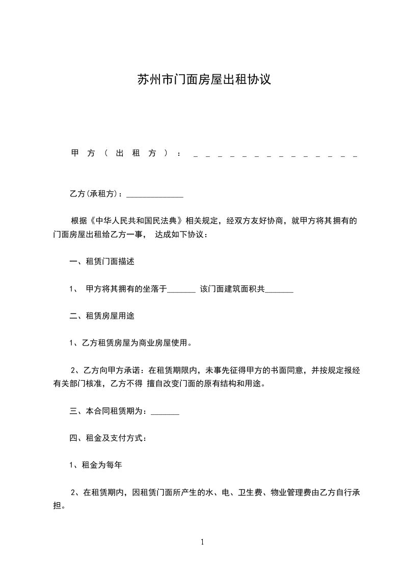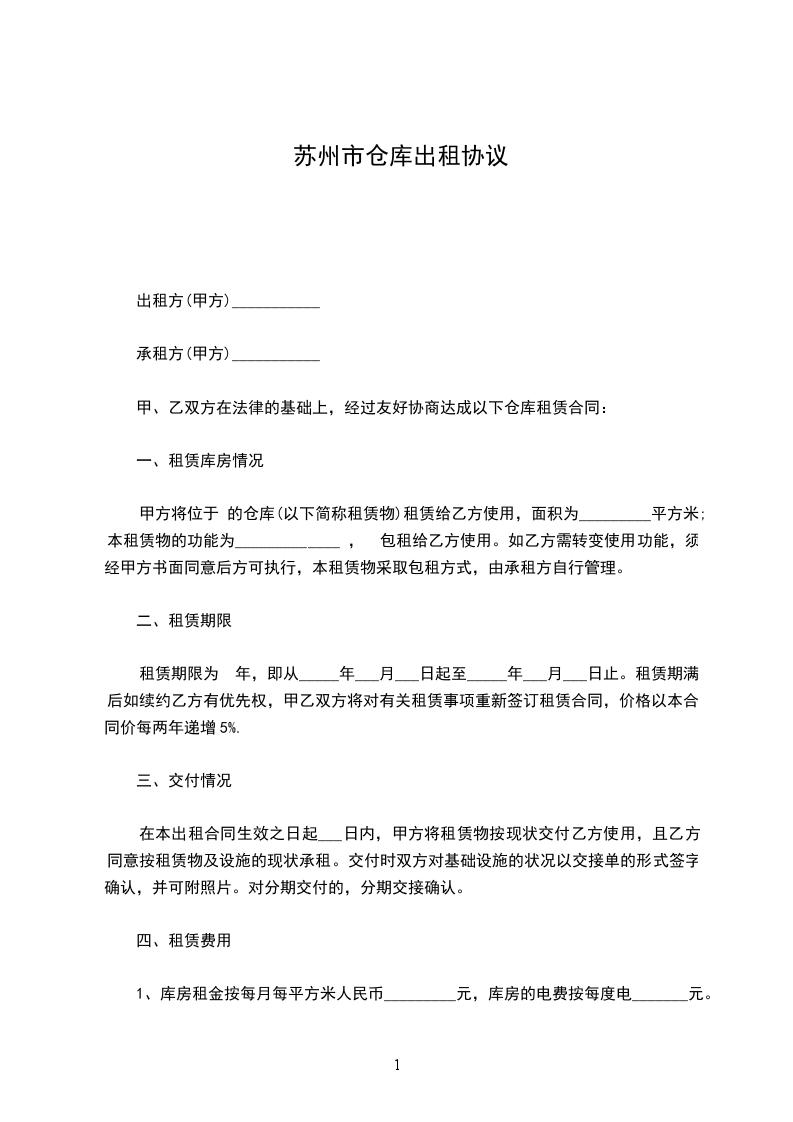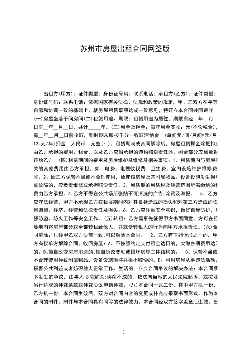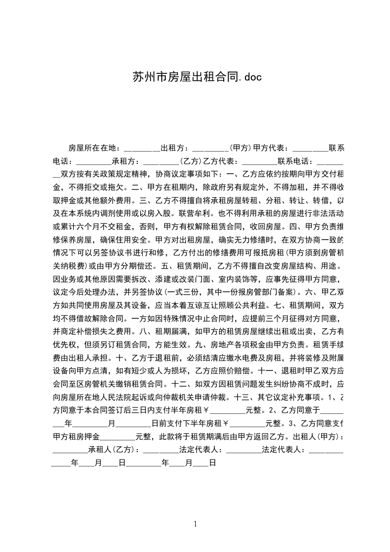 一、甲方将位于苏州市____街道___小区___号楼号的房屋出租给乙方居住使用,租赁期限自______年___月___日至____年___月___日,计___个月。