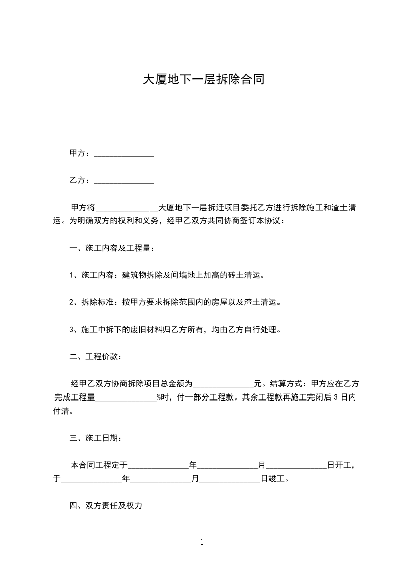 甲方将_______________大厦地下一层拆迁项目委托乙方进行拆除施工和渣土清运。为明确双方的权利和义务,经甲乙双方共同协商签订本协议: