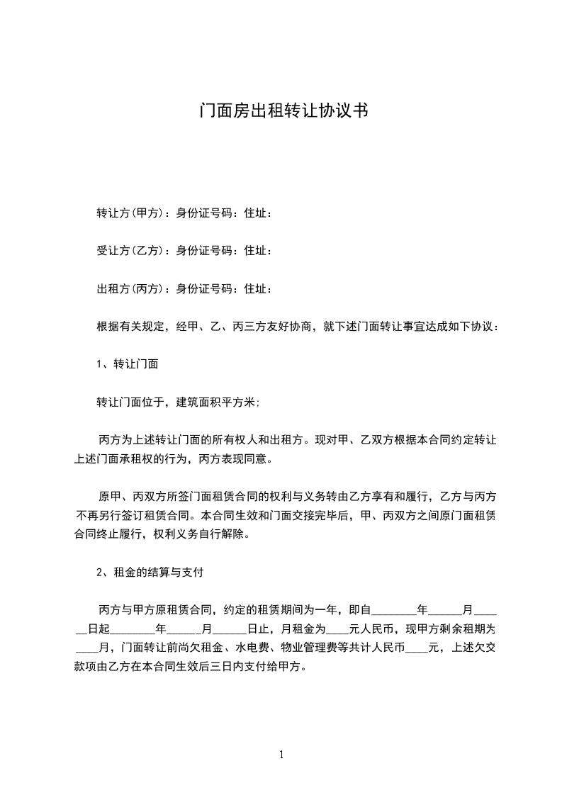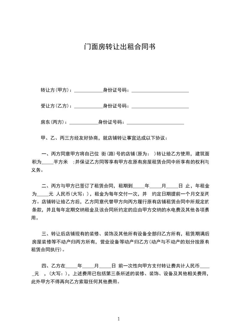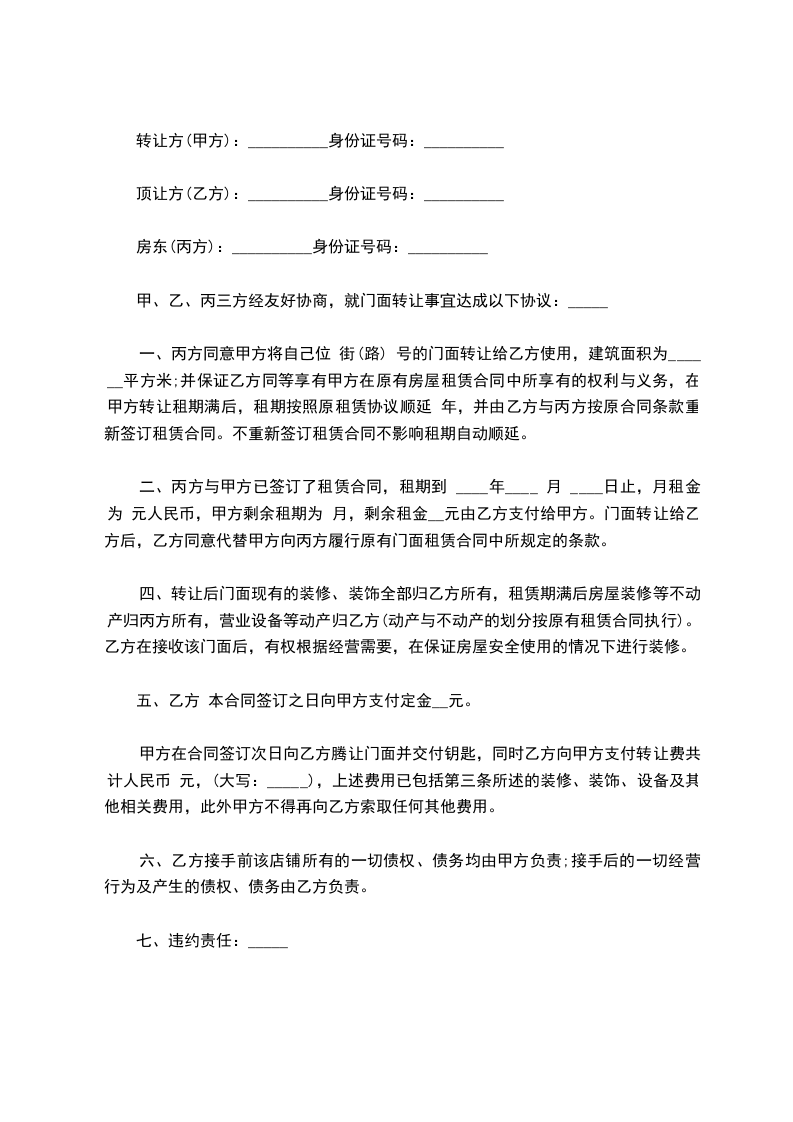 一、丙方同意甲方将自己位于____________街(路)____________号的门面转让给乙方使用,建筑面积为 ____________平方米;并保证乙方同等享有甲方在原有房屋租赁合同中所享有的权利与义务,在甲方转让租期满后,租期按照原租赁协议顺延 年,并由乙方与丙方按原合同条款重新签订租赁合同。不重新签订租赁合同不影响租期自动顺延。