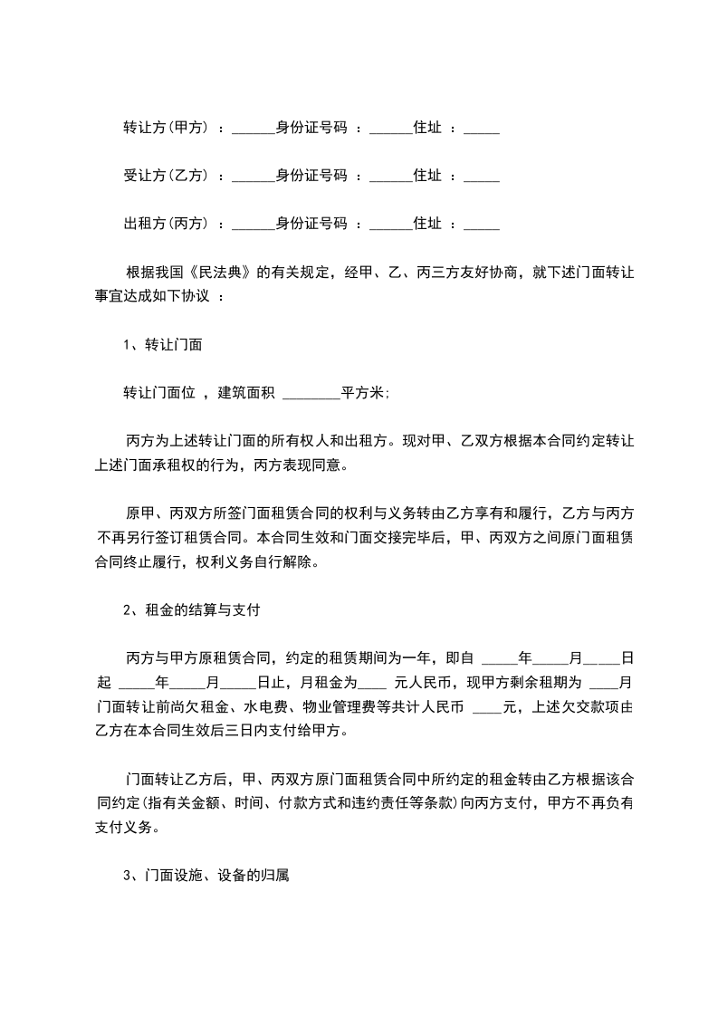 甲、乙、丙三方经友好协商,就门面转让事宜达成以下协议:
