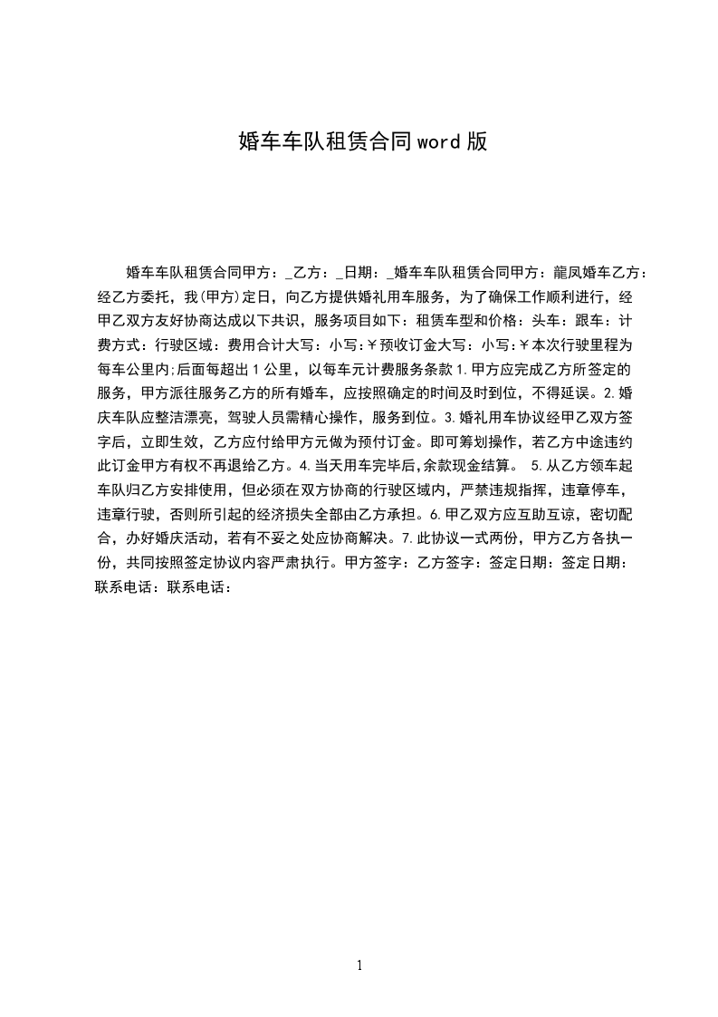 2、婚车在协议时间后半小时内到达协议规定地点,由乙方负责赔偿合同款的25%,超过半小时至1小时赔偿合同款的50%,超过1小时则甲方可免付本次租赁费。