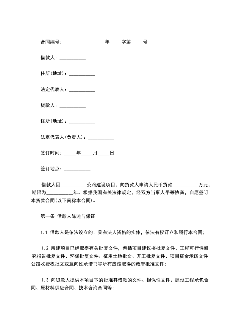 借款人因___________公路建设项目,向贷款人申请人民币贷款___________万元,期限为___________年。根据我国有关法律规定,经双方当事人平等协商,自愿签订本贷款合同(以下简称本合同)。