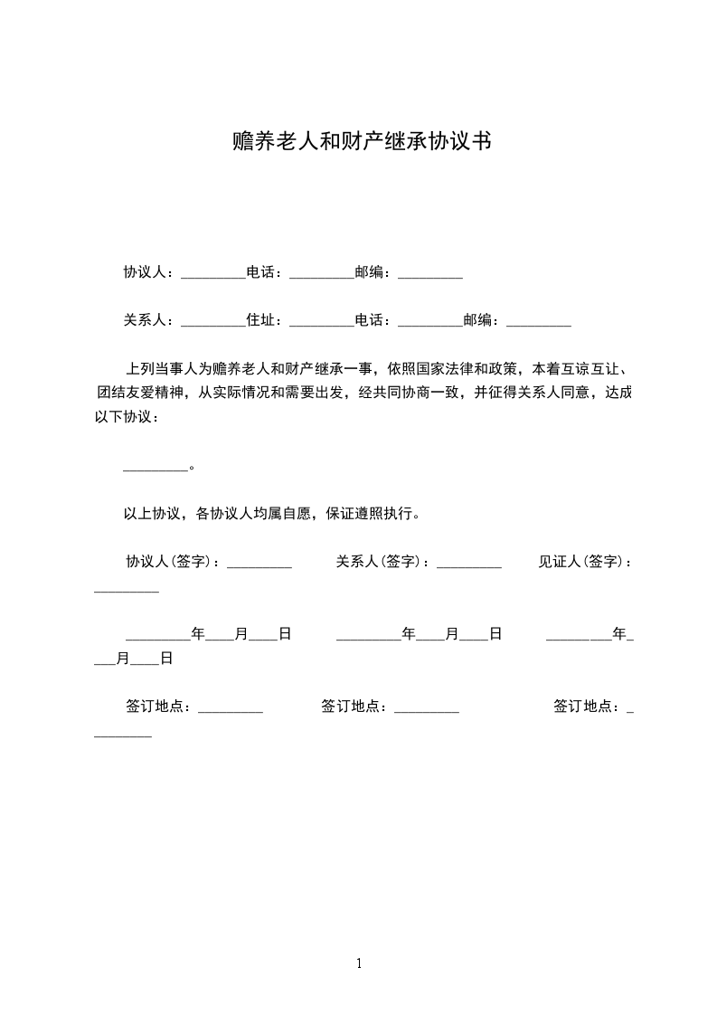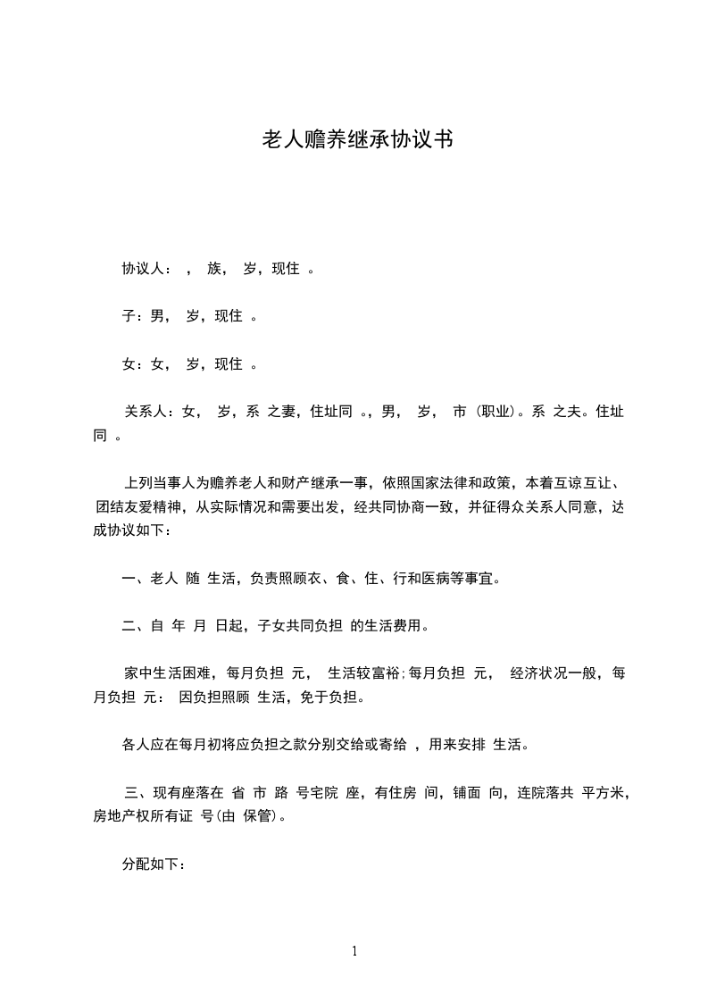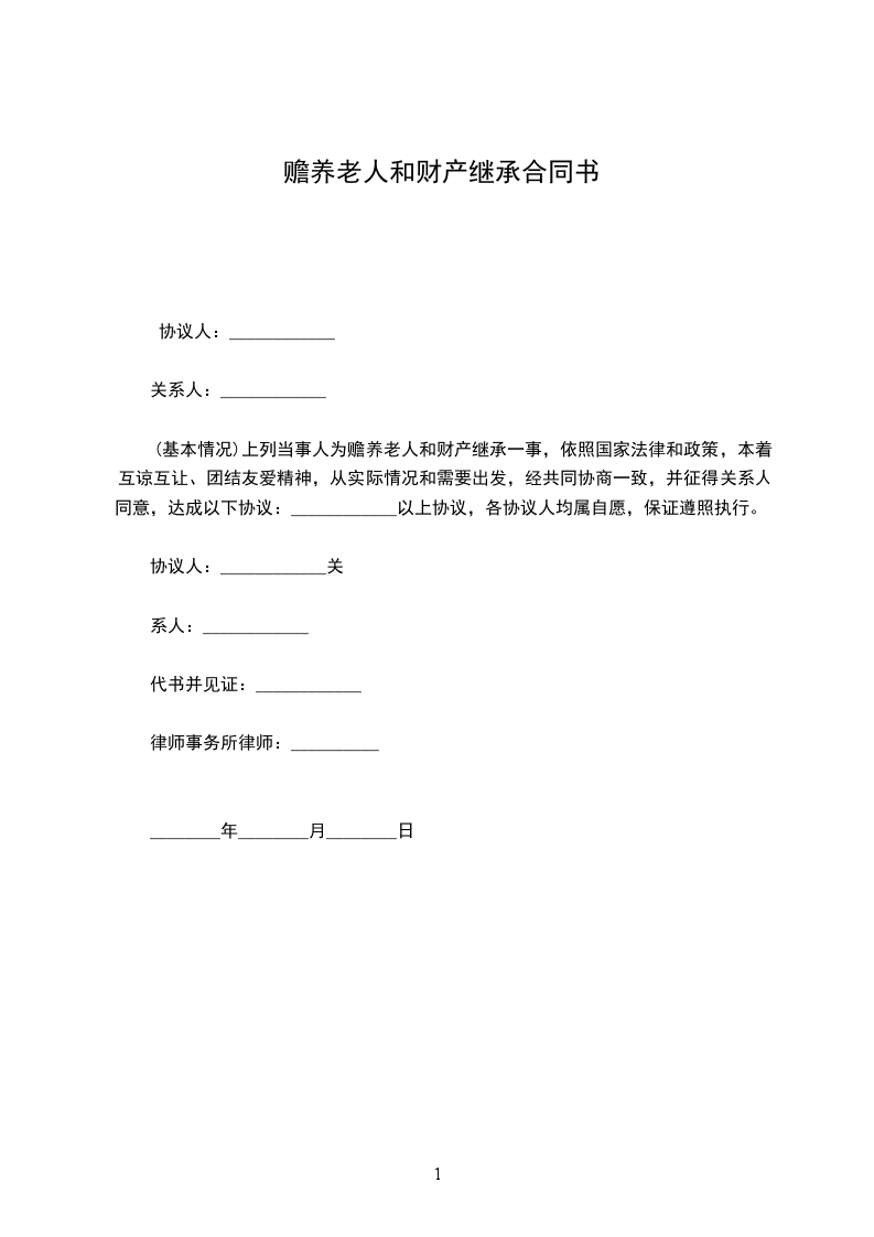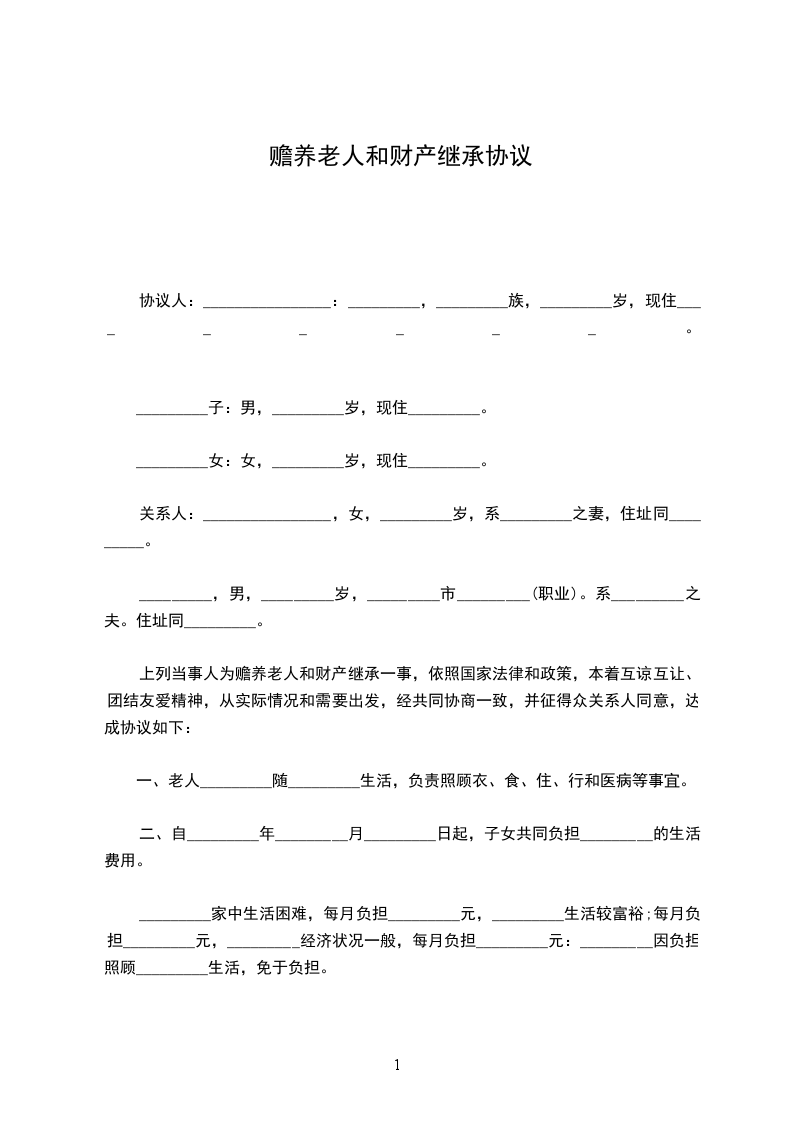 上列当事人为赡养老人和财产继承一事,依照国家法律和政策,本着互谅互让、团结友爱精神,从实际情况和需要出发,经共同协商一致,并征得关系人同意,达成以下协议:________________