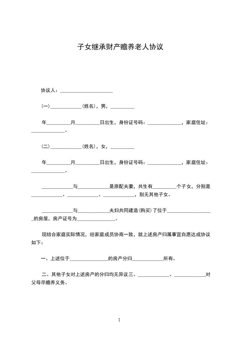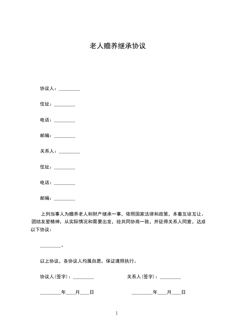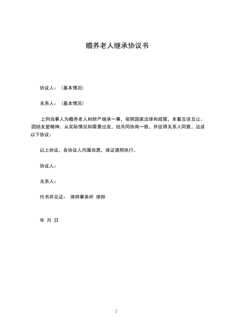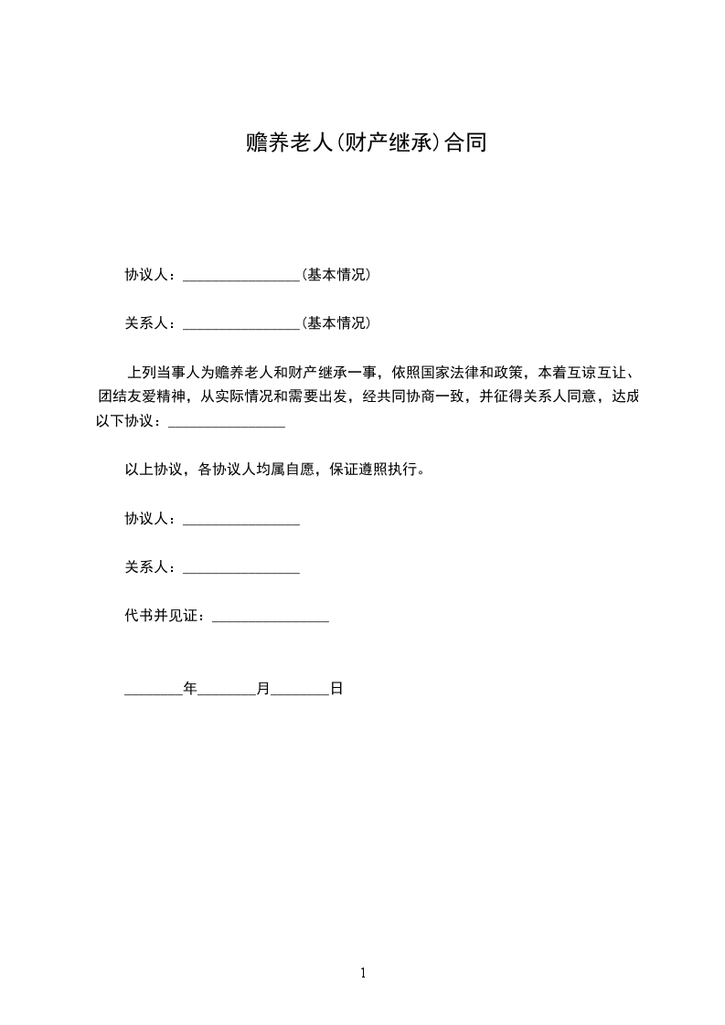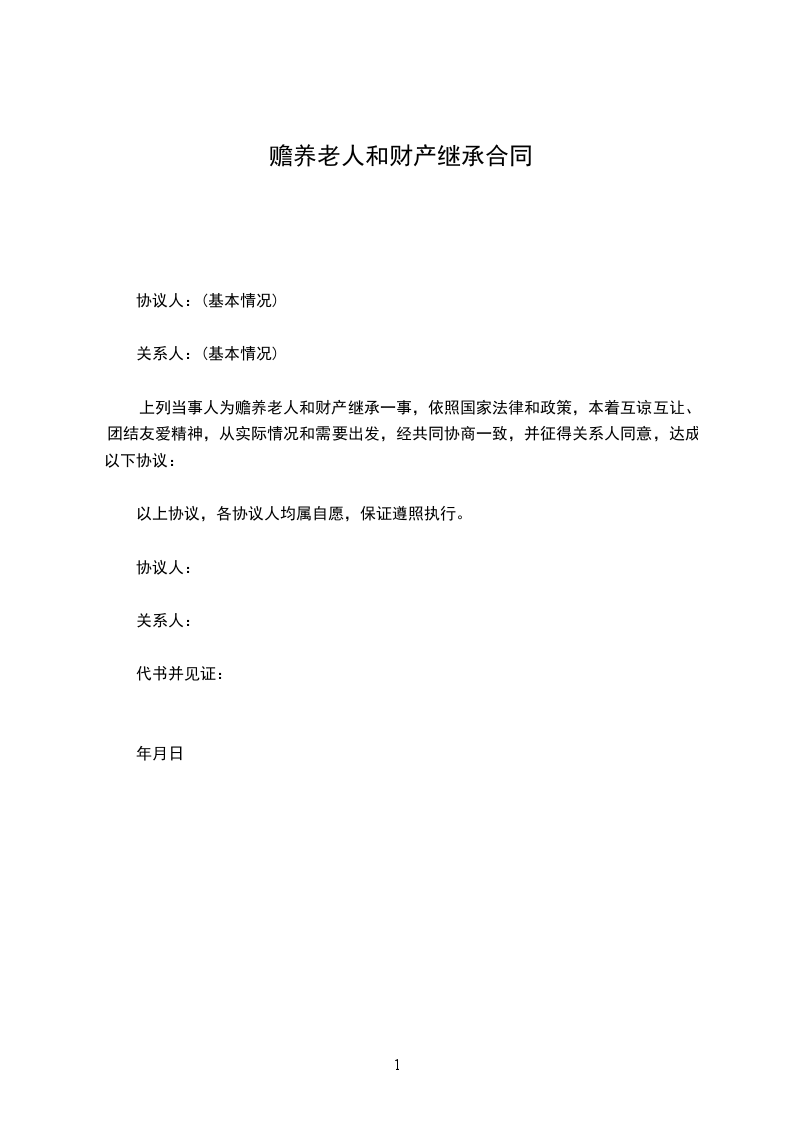 上列当事人为赡养老人和财产继承一事,依照国家法律和政策,本着互谅互让、团结友爱精神,从实际情况和需要出发,经共同协商一致,并征得关系人同意,达成以下协议:________________