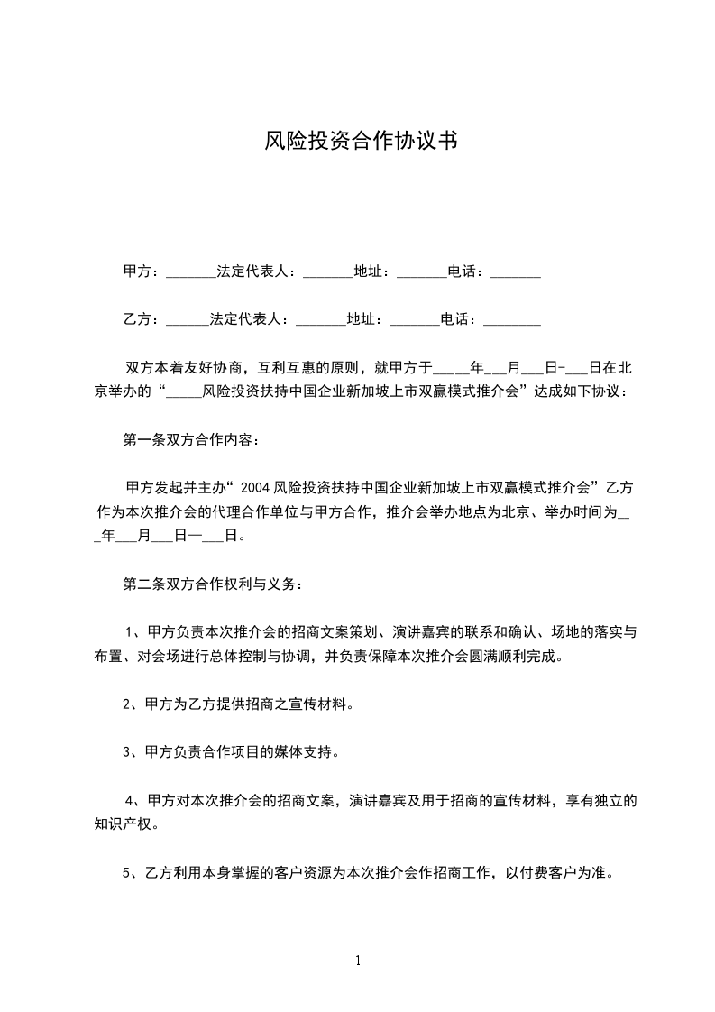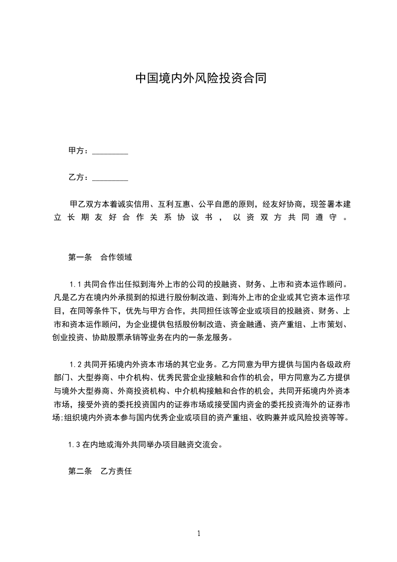1.2共同开拓境内外资本市场的其它业务。乙方同意为甲方提供与国内各级政府部门、大型券商、中介机构、优秀民营企业接触和合作的机会,甲方同意为乙方提供与境外大型券商、外商投资机构、中介机构接触和合作的机会,共同开拓境内外资本市场,接受外资的委托投资国内的证券市场或接受国内资金的委托投资海外的证券市场;组织境内外资本参与国内优秀企业或项目的资产重组、收购兼并或风险投资等等。