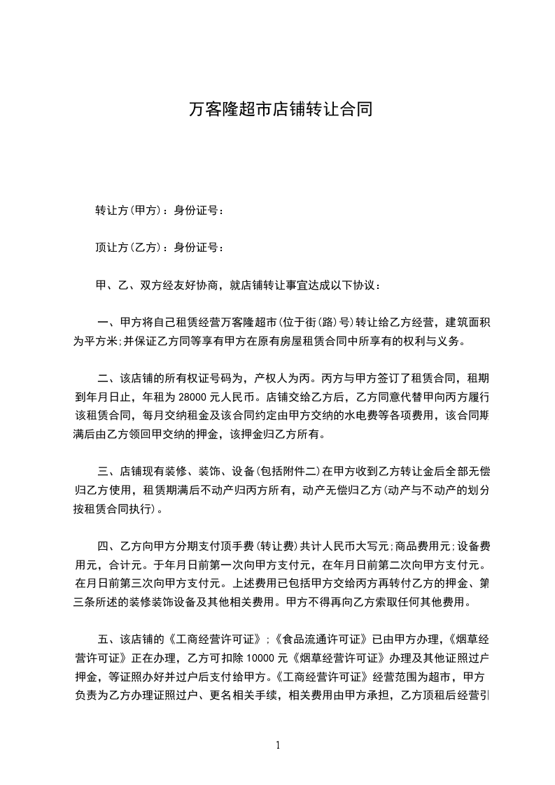 一、甲方将自己租赁经营万客隆超市(位于街(路)号)转让给乙方经营,建筑面积为_____平方米;并保证乙方同等享有甲方在原有房屋租赁合同中所享有的权利与义务。