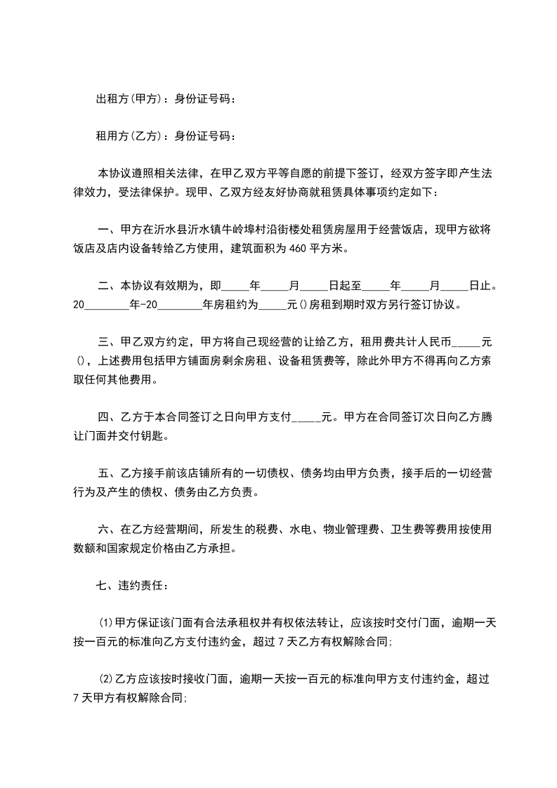 三、甲乙双方约定,甲方将自己现经营的让给乙方,租用费共计人民币_____元(),上述费用包括甲方铺面房剩余房租、设备租赁费等,除此外甲方不得再向乙方索取任何其他费用。