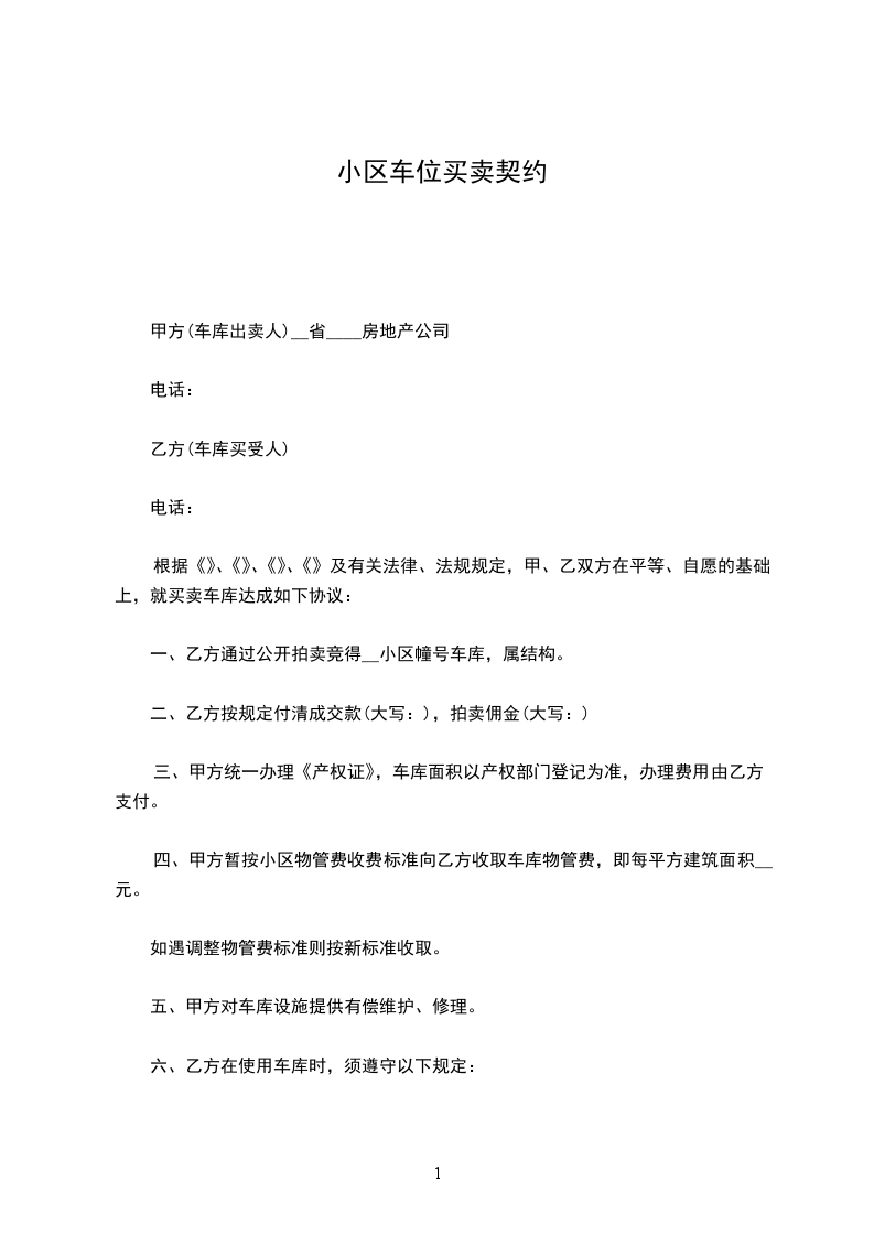 根据《》、《》、《》、《》及有关法律、法规规定,甲、乙双方在平等、自愿的基础上,就买卖车库达成如下协议: