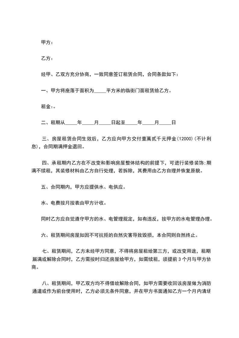 一、甲方将座落于面积为_____平方米的临街门面租赁给乙方。