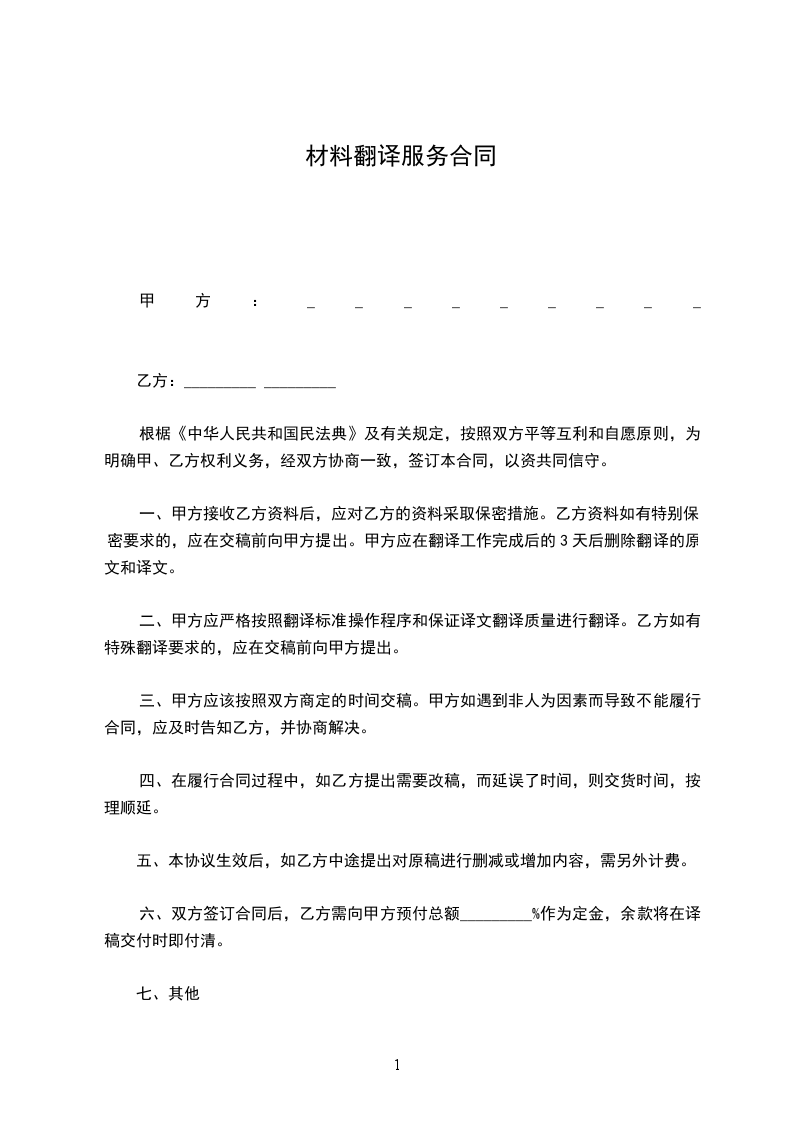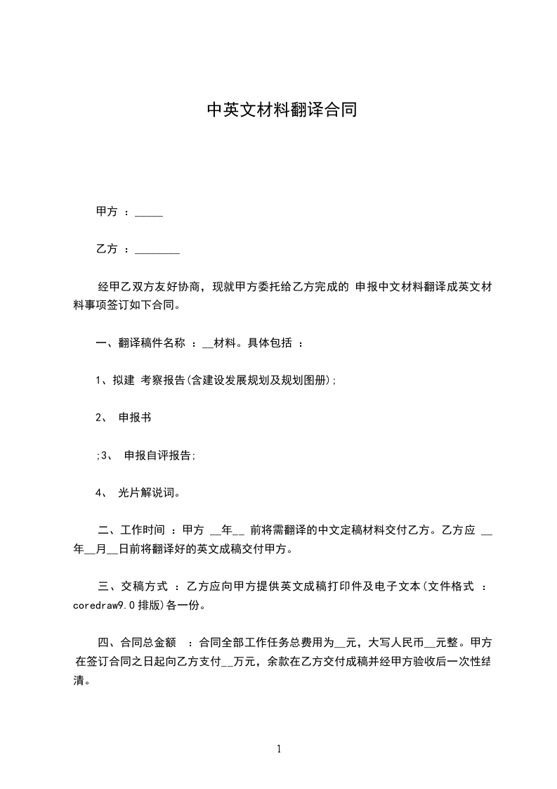 经甲乙双方友好协商,现就甲方委托给乙方完成的__申报中文材料翻译成英文材料事项签订如下协议。