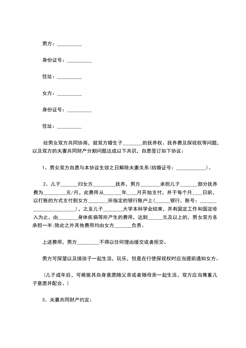 儿子由男方抚养,随同男方生活,抚养费由男方全部负责,不由女方承担任何费用。