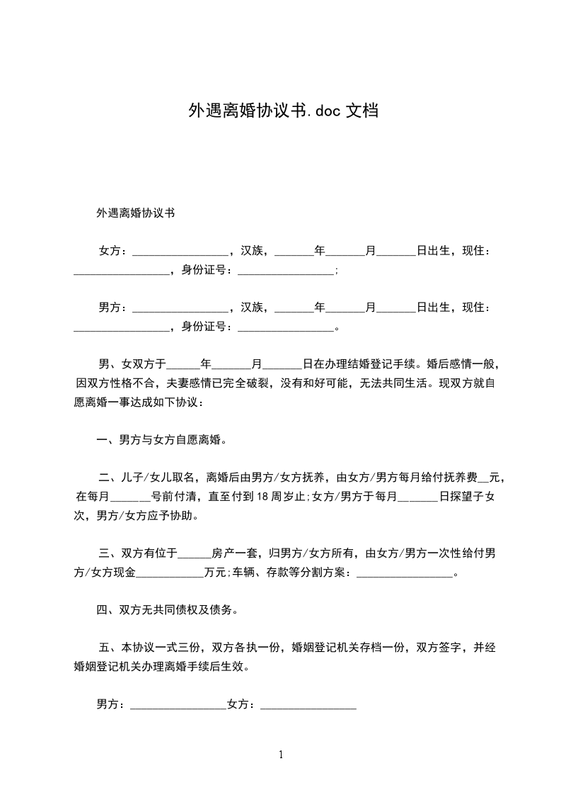 因女方有外遇致使夫妻感情确已破裂,已无和好可能,现经夫妻双方自愿协商达成一致意见,订立离婚协议如下: