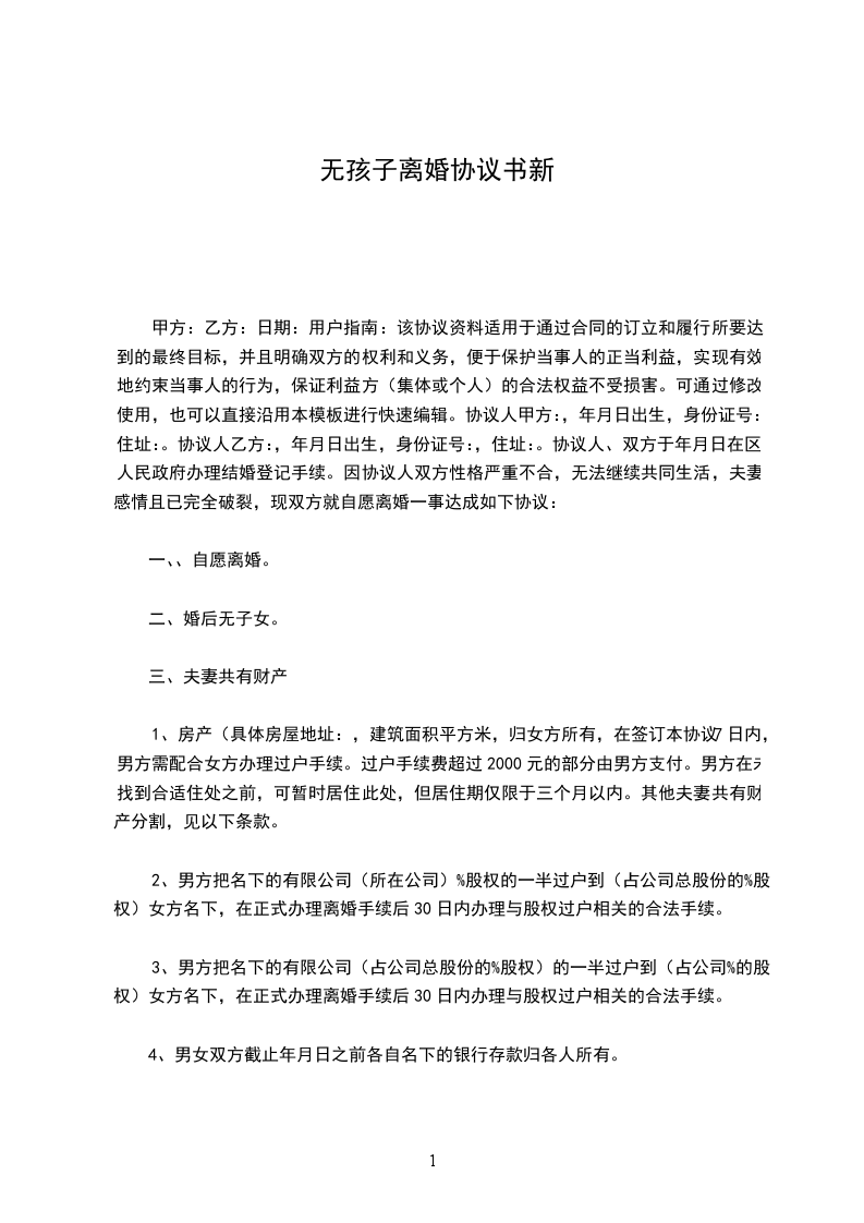 1、房产(具体房屋地址:_______________________________,建筑面积_________平方米,归女方所有,在签订本协议7日内,男方需配合女方办理过户手续。