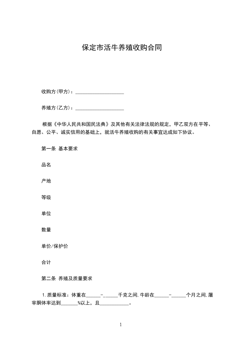 根据《中华人民共和国民法典》及其他有关法律法规的规定,甲乙双方在平等、自愿、公平、诚实信用的基础上,就活牛养殖收购的有关事宜达成如下协议。
